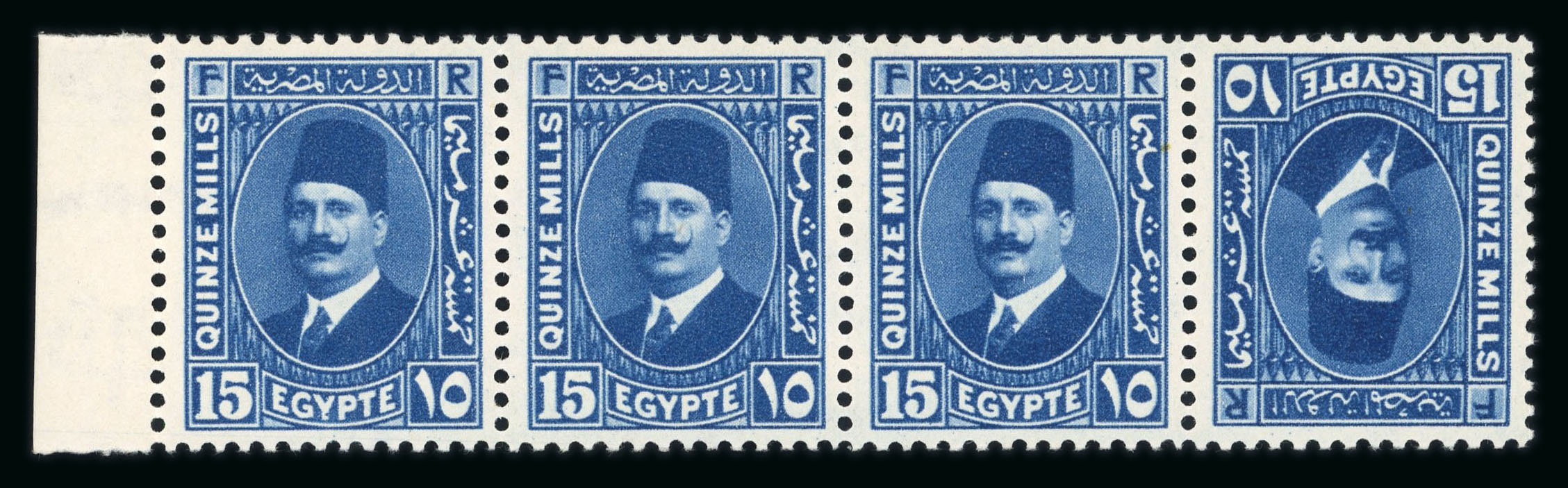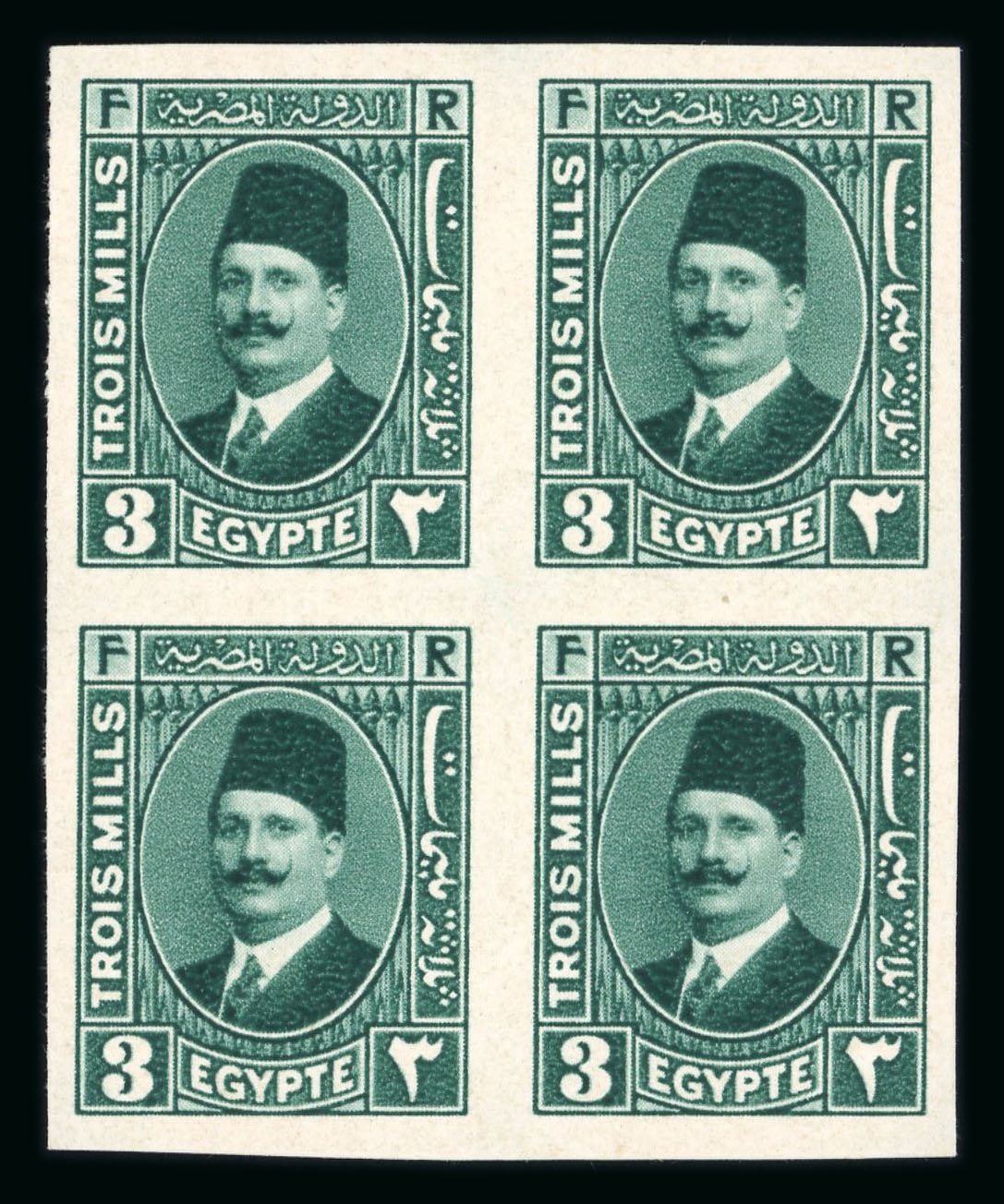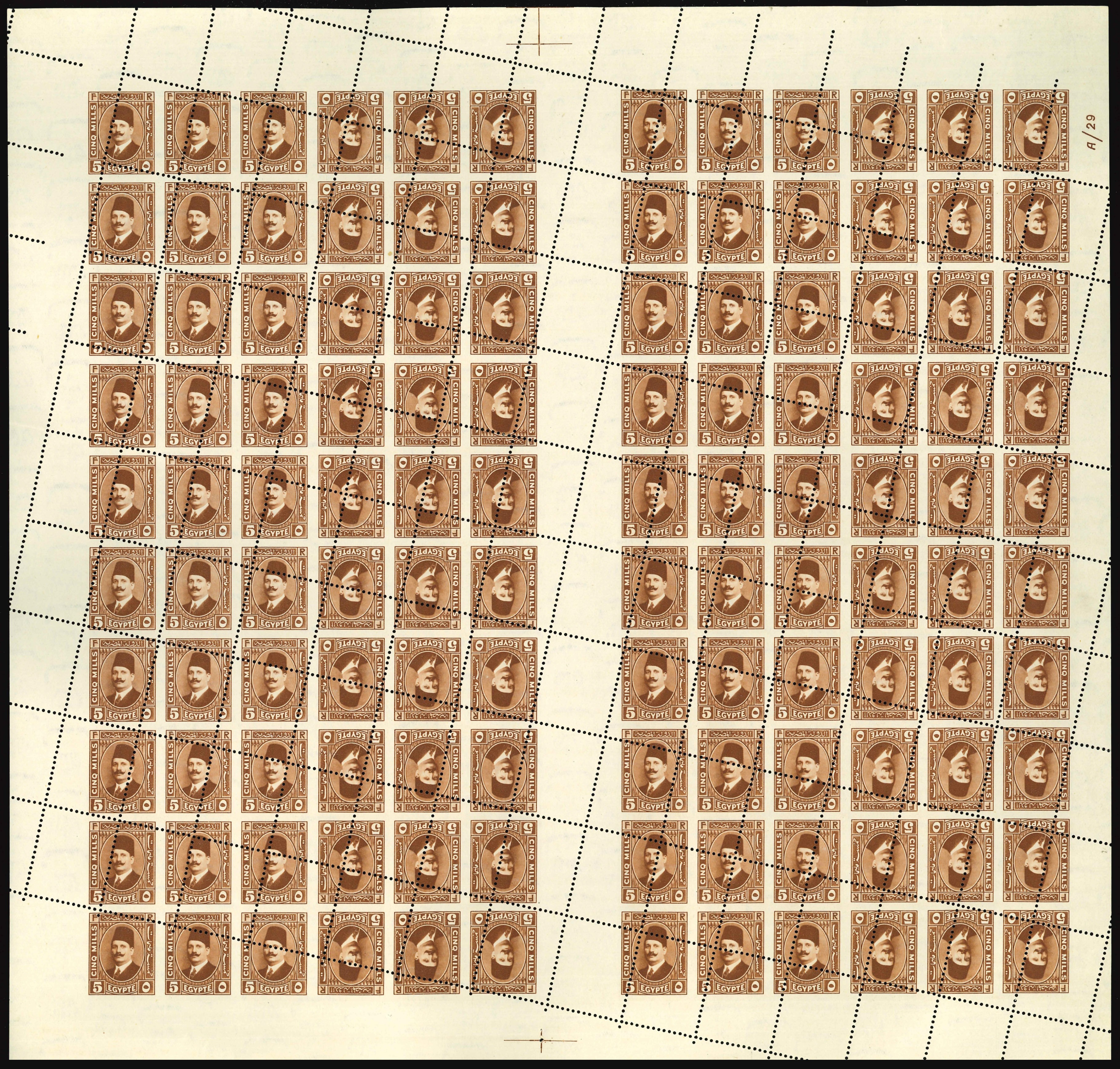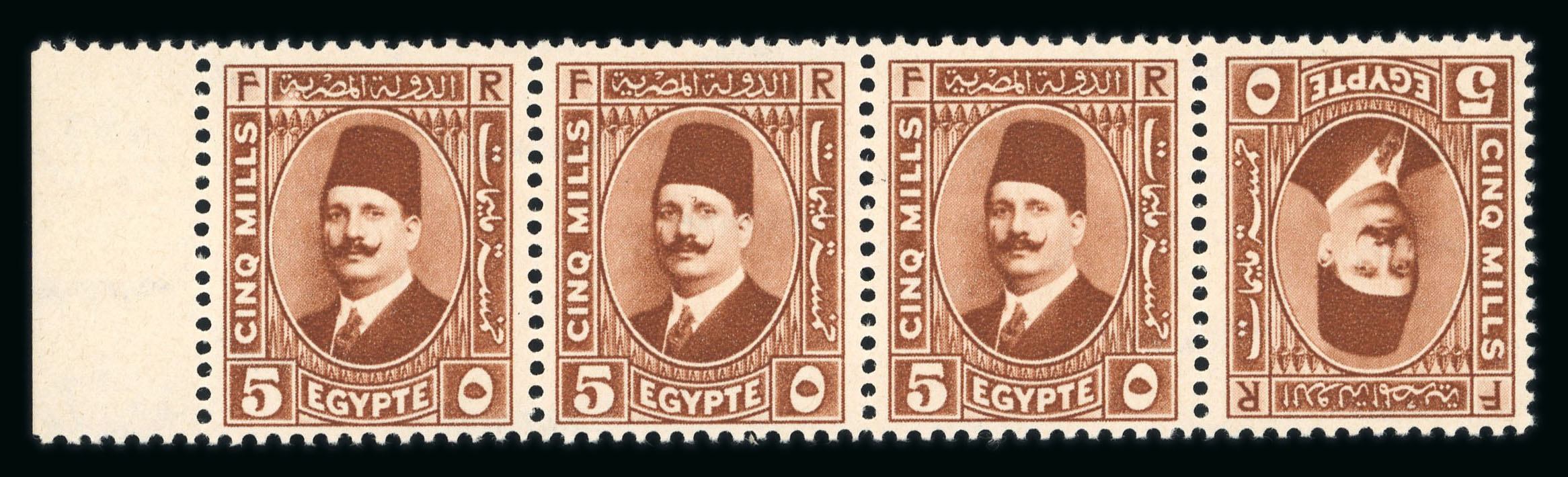 1927-37 King Fouad 2nd Portrait 5m dark red-brown, type II, mint nh bottom left corner sheet marginal control number A/30 block of ten with two tête-bêche pairs, showing Royal misperfs., very fine and a very scarce block. (Image 1)