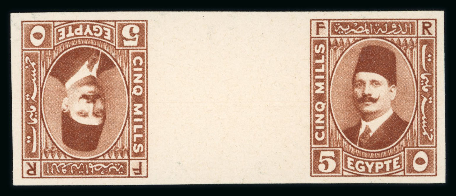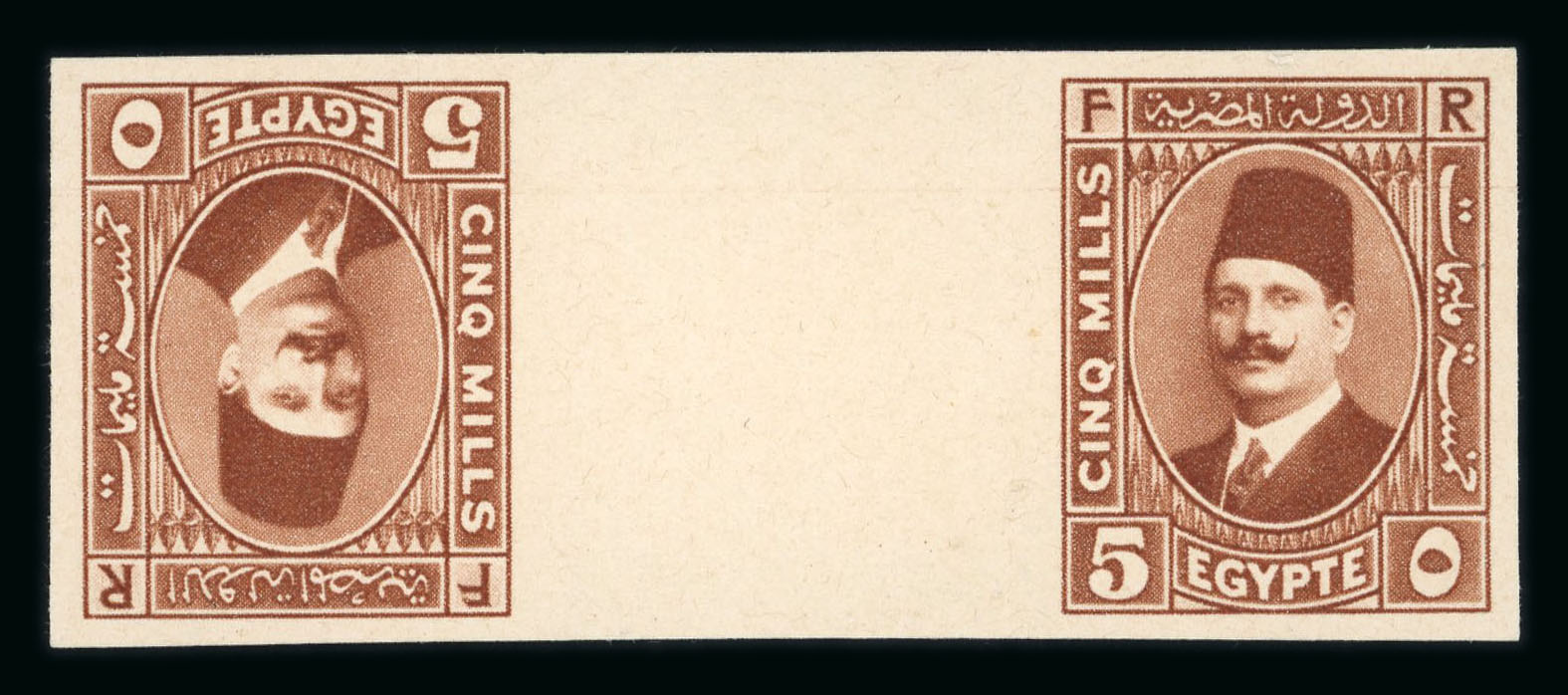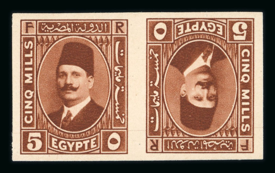1927-37 King Fouad 2nd Portrait Issue: 5m dark red-brown, tete-beche pair, showing Royal cancelled on reverse, very fine and scarce (NP D112j, $300) (Image 1)