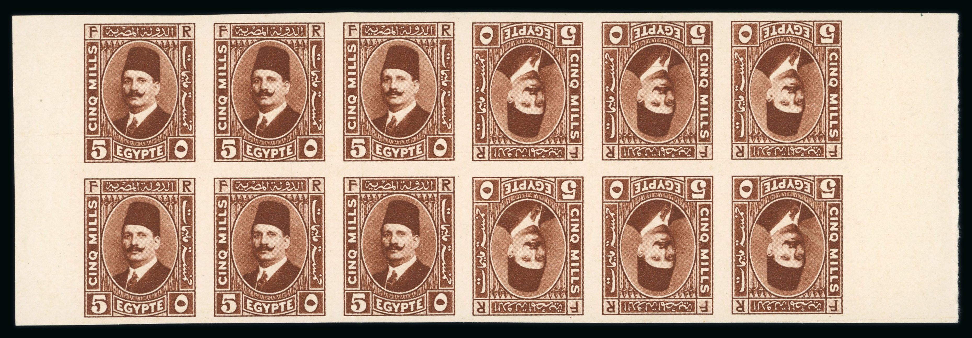 1927-37 King Fouad 2nd Portrait Issue: 5m dark red-brown, horizontal sheet marginal block of twelve, showing tête-bêche booklet panes of six with Royal cancelled on reverse, very fine and scarce. (Image 1)