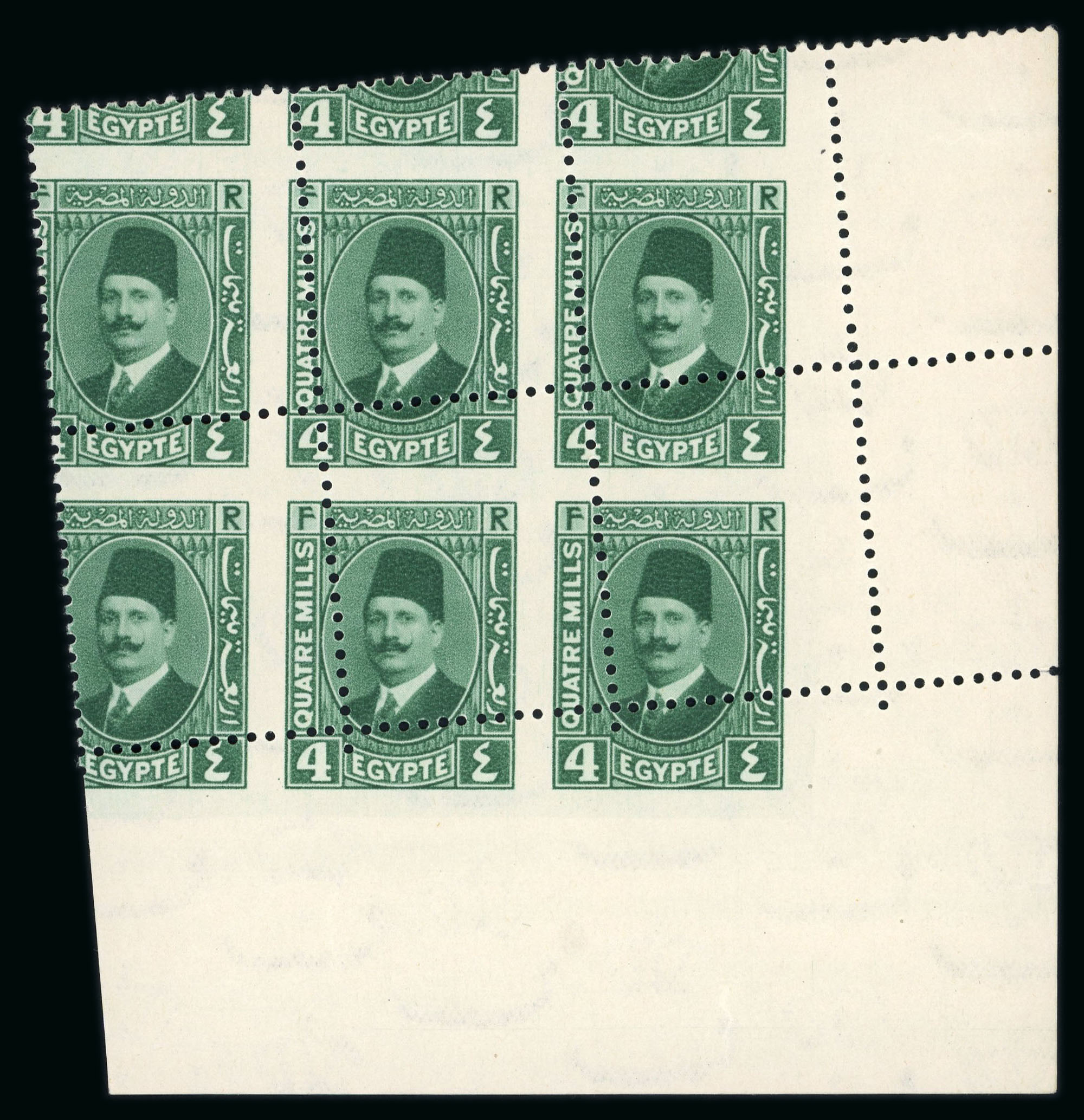 1927-37 King Fouad 2nd Portrait Issue: 4m deep green, type II, mint nh corner right sheet marginal block of six, showing Royal oblique perforations, very fine (NP D110d, $180+) (Image 1)