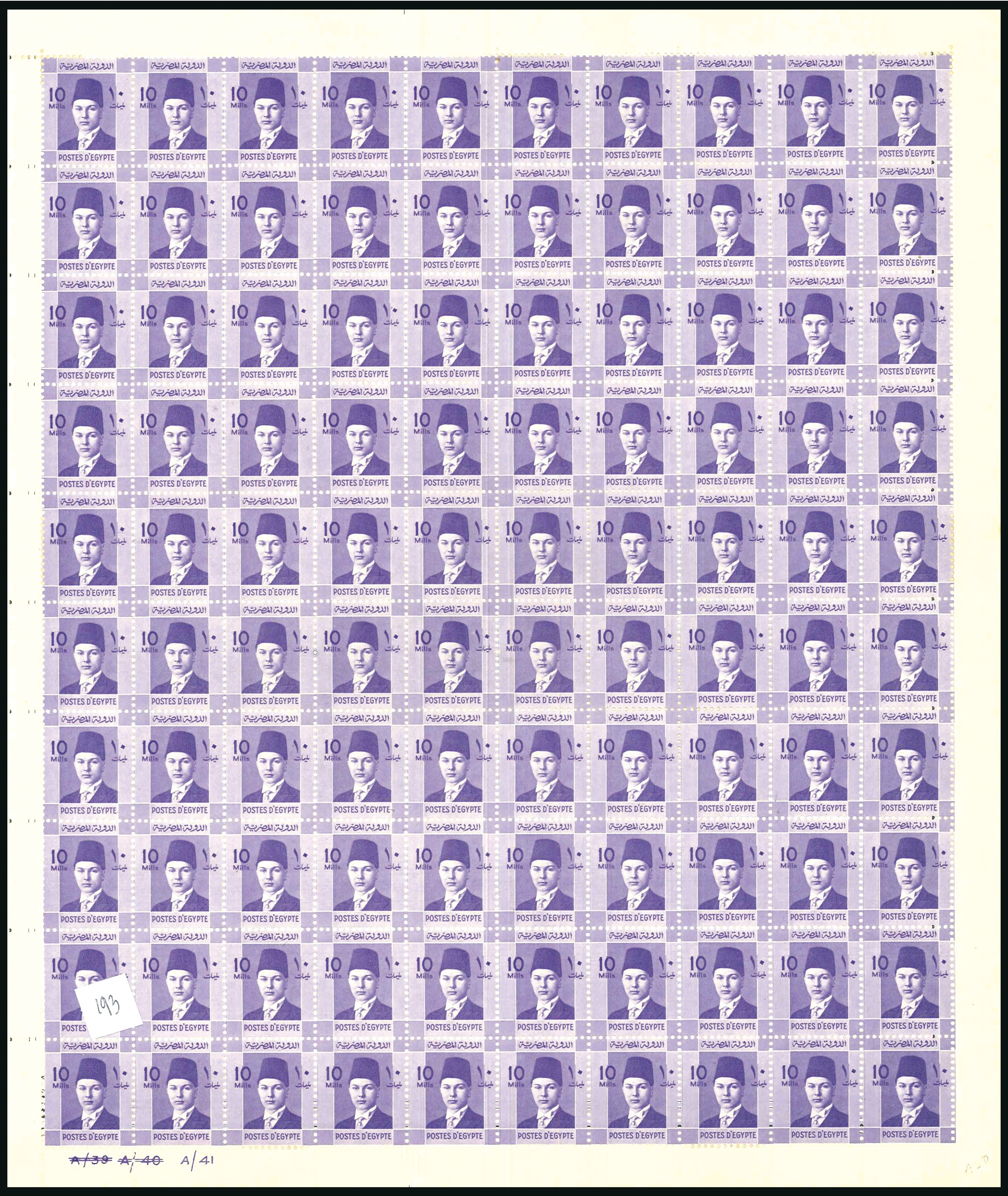 1937-46 Young Farouk 10m deep violet sheet of 100 stamps with inverted watermark, control number A/39 A/40 A/41, rarely seen in full sheet (NP $550). (Image 1)