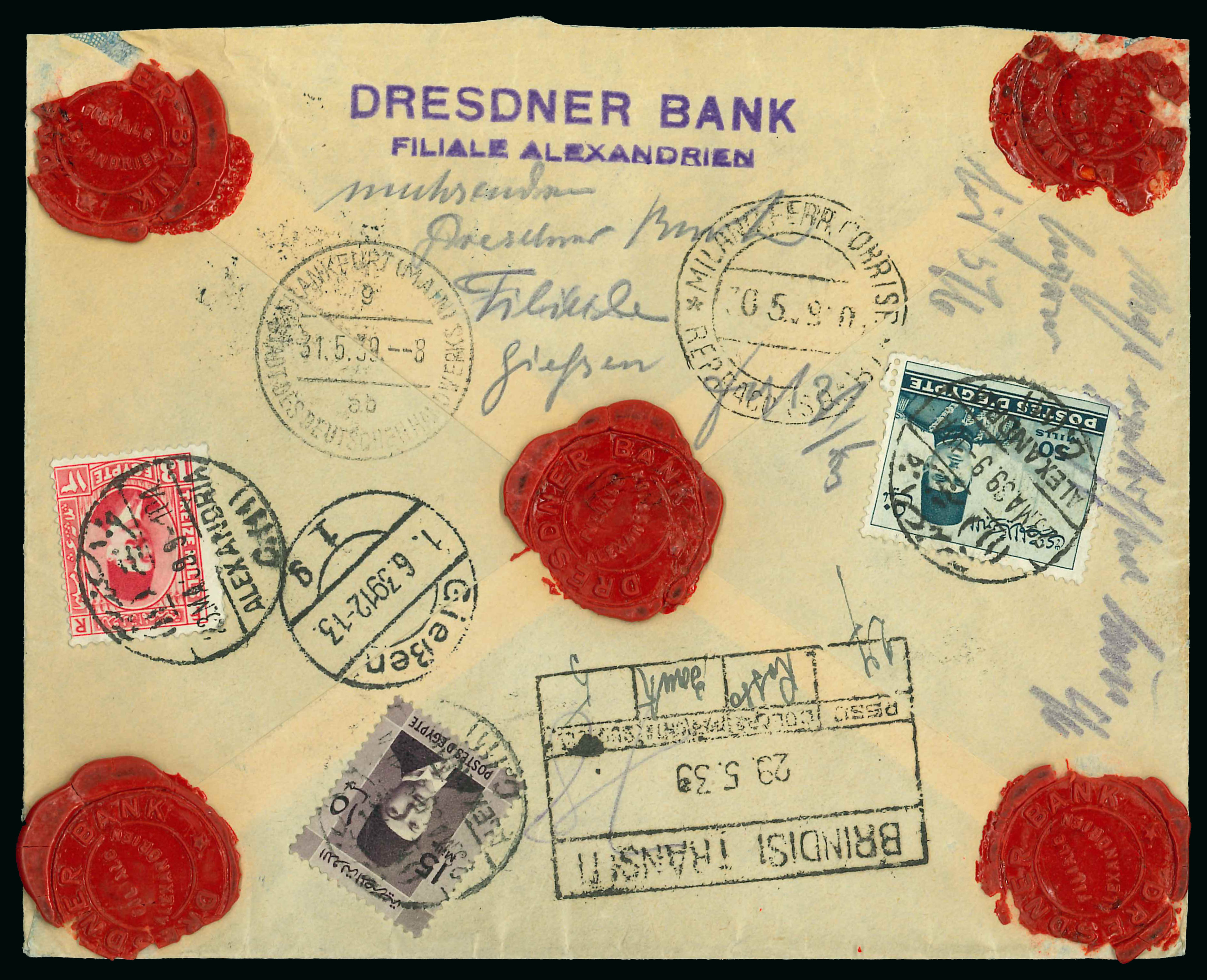 1937-46 Young King Farouk Portrait Issue: 50m Greenish-blue, used in combination 13m and 15m values, all neatly tied by ALEXANDRIA/23.4 cds on reverse of insured cover to Germany, with manuscript on front "Valeur déclarée ...." and "V21 /