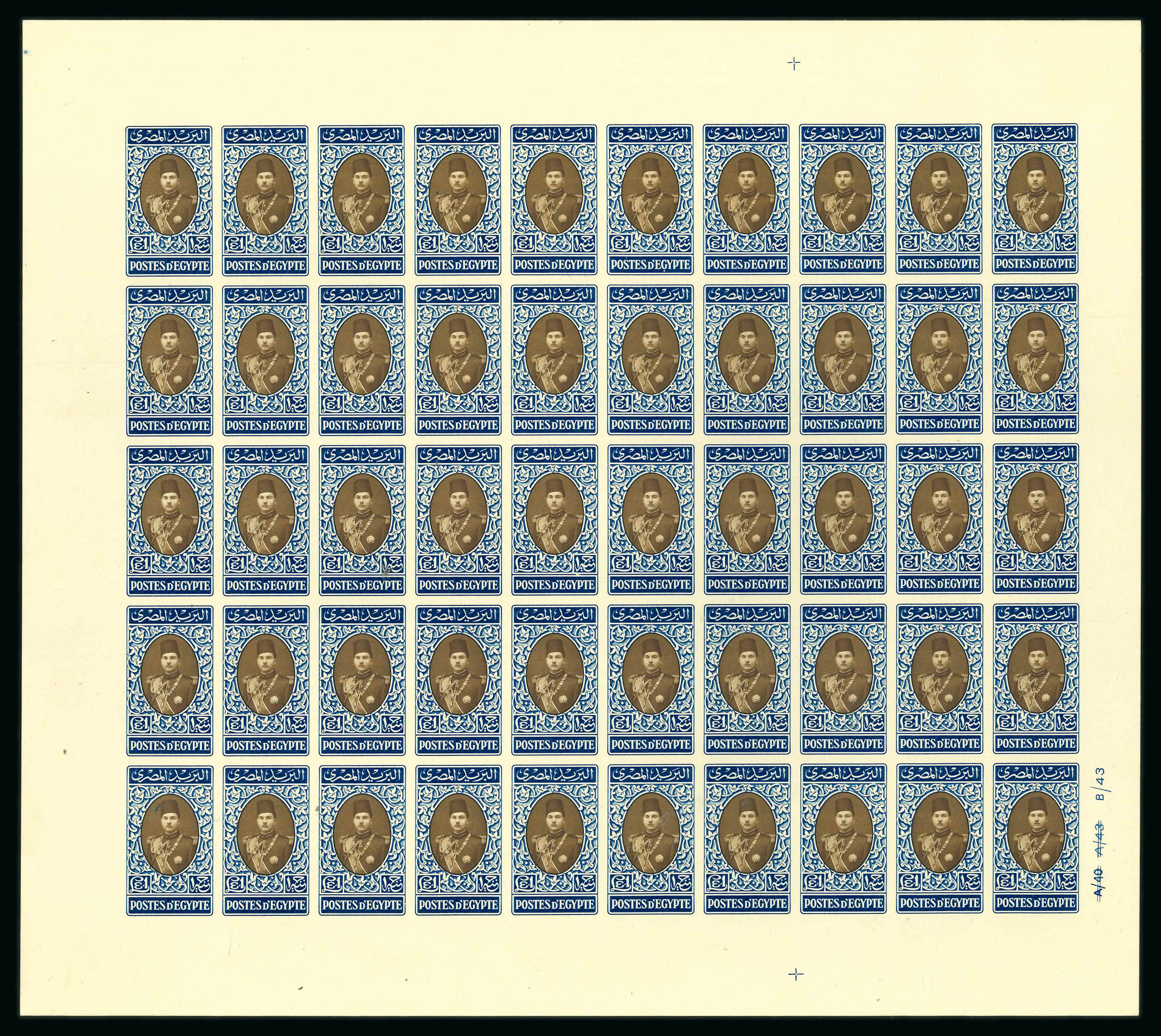 1937-46 Young King Farouk Portrait Issue: £E1 Blue and sepia, Royal cancelled on reverse, a complete sheet of 50 with control numbered "A/40 A/43 B/43", very fine and extremely rare, the unique uncut sheet. (Image 1)