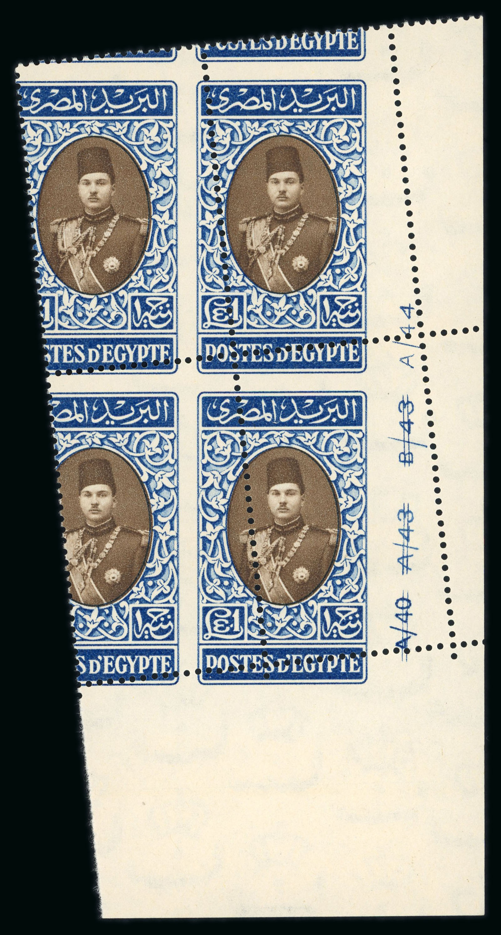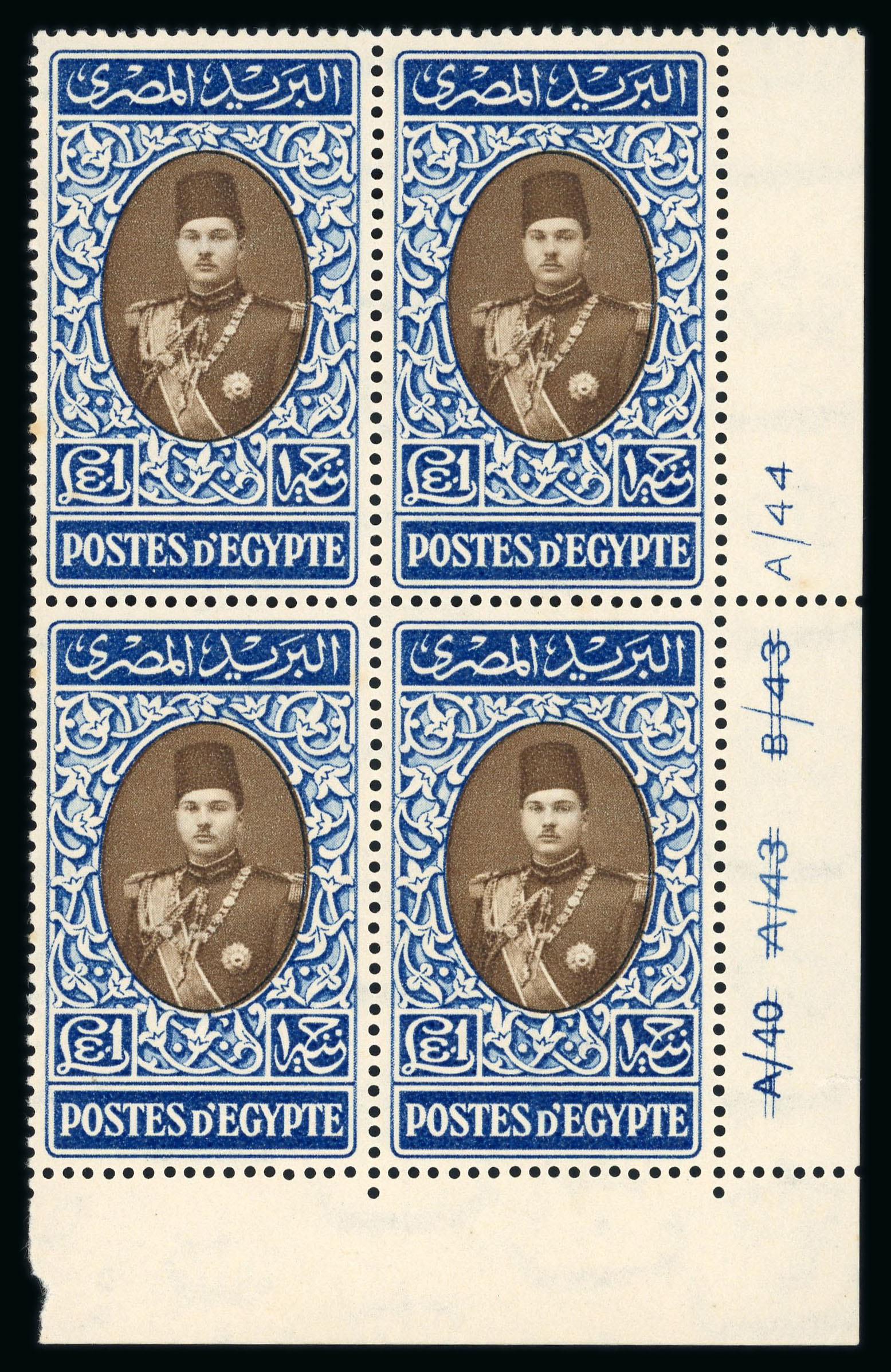 1937-46 Young King Farouk: E£1 blue and sepia, mint nh bottom right corner sheet marginal control number A/40, A/43, B43, A/44 block of four, showing Royal oblique perforations, fresh, very fine and extremely rare. (Image 1)