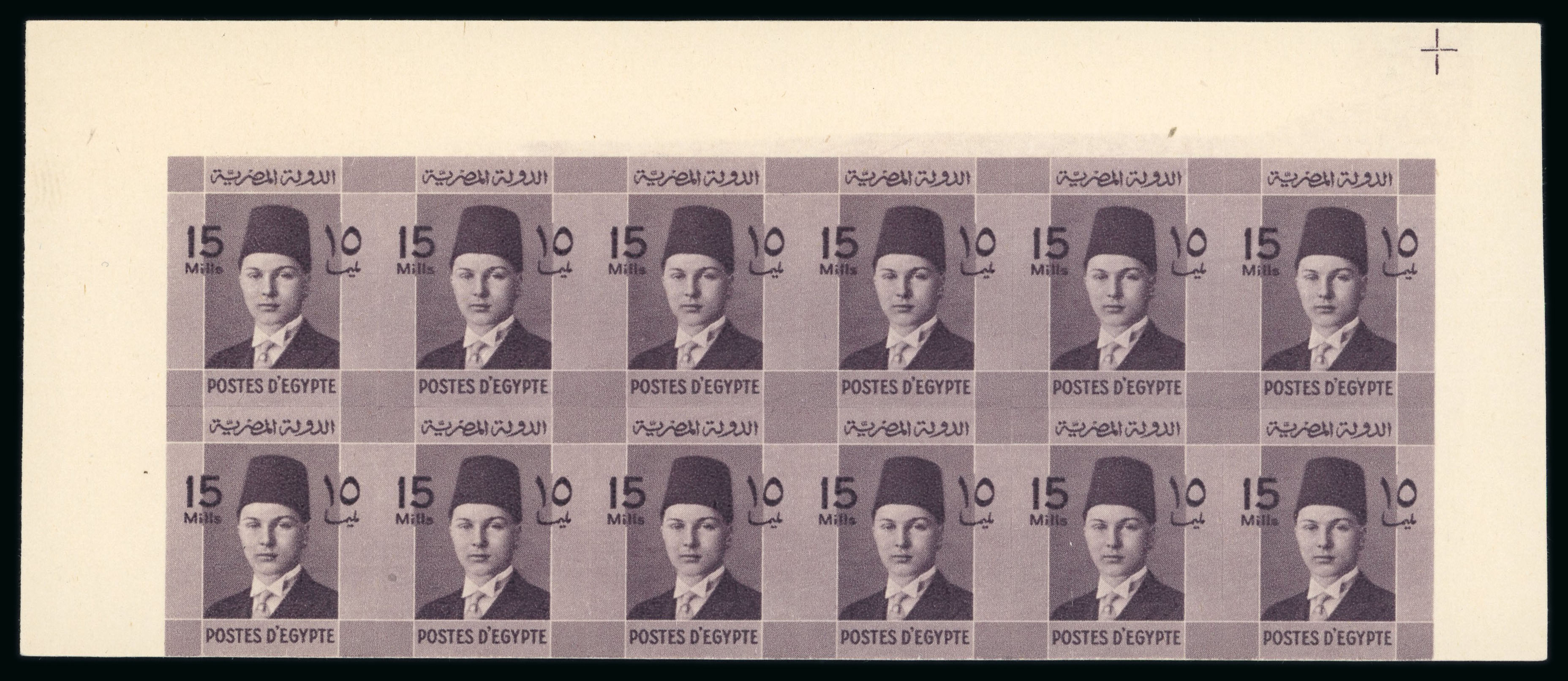 1937-46 Young Farouk: 15m dark violet-brown, top sheet marginal booklet pane strip of twelve, showing Royal cancelled on reverse, very fine and very scarce (Image 1)