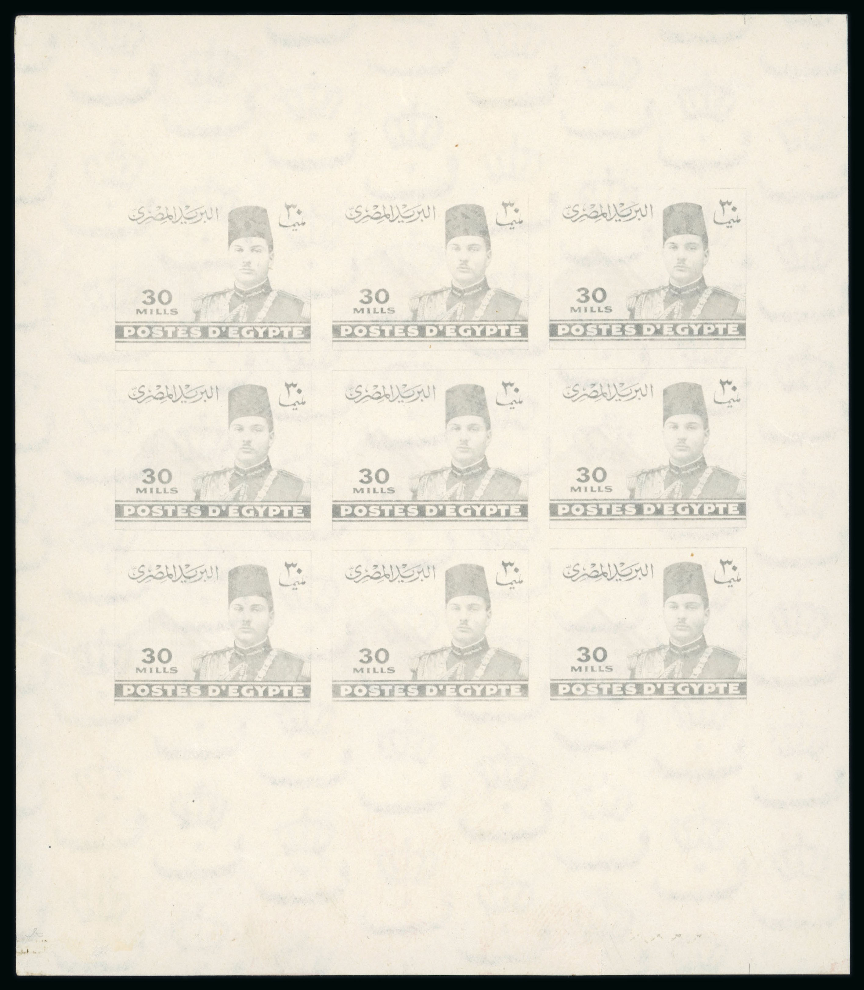 1937-46 Young King Farouk: 30m very light gray, Royal sheetlet of nine, very fine and extremely rare showpiece (NP RDP147(a) $4'000). (Image 1)