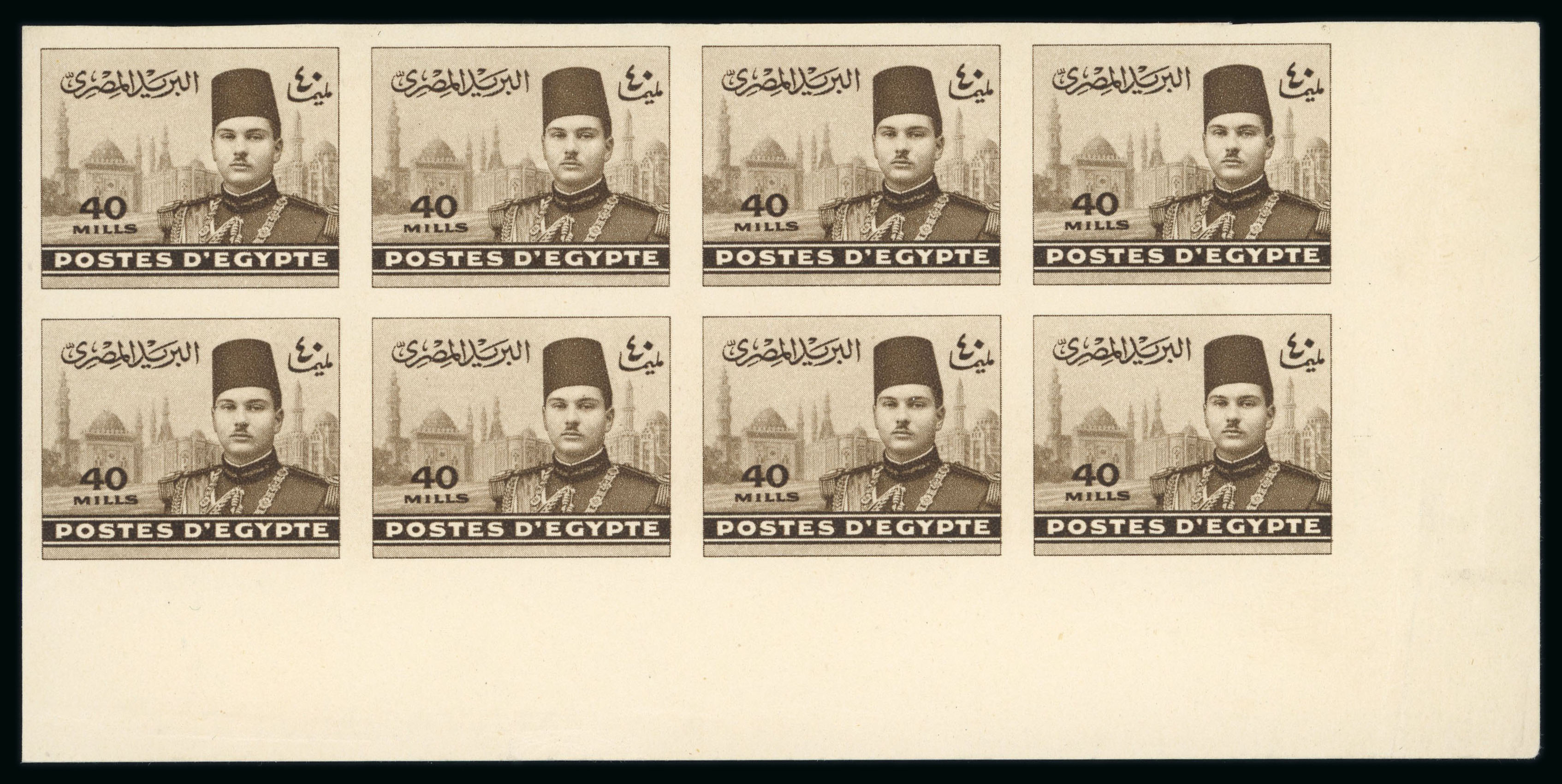 1937-46 Young King Farouk: 40m sepia, bottom right corner sheet marginal block of eight, showing Royal cancelled on reverse, very fine and scarce (NP D149b, $320+) (Image 1)