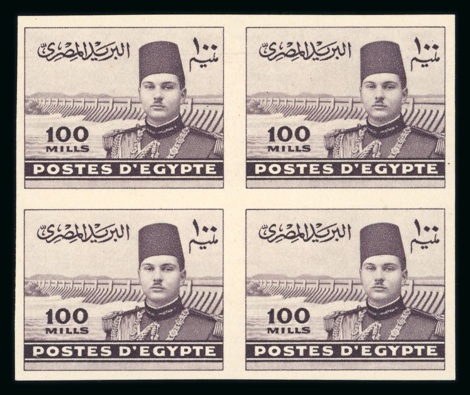 1937-46 Young King Farouk: 100m dull purple, block of four, showing Royal cancelled on reverse, very fine and scarce (NP D151b, $160+) (Image 1)