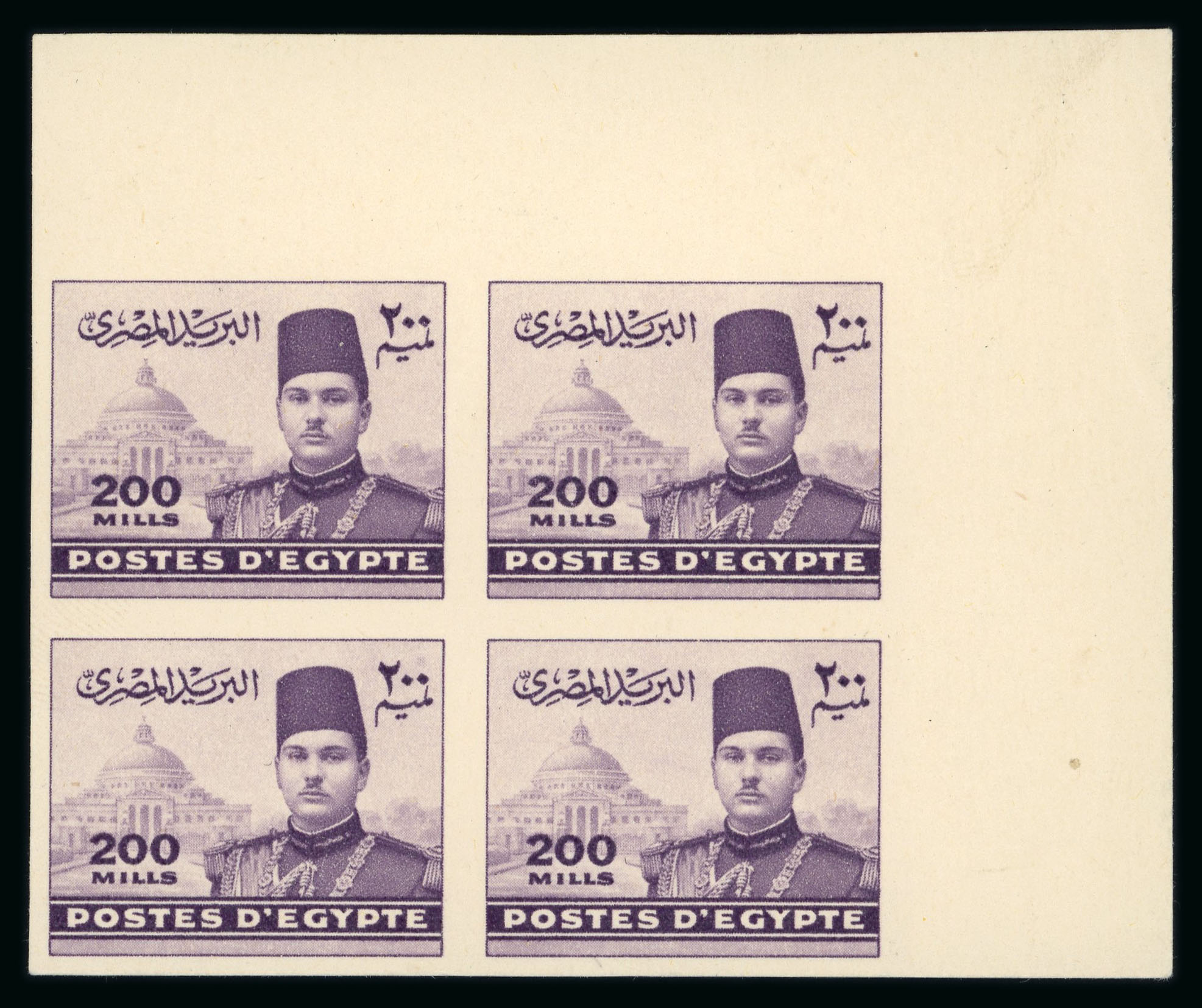 1937-46 Young King Farouk: 200m dull purple, top right corner sheet marginal block of four, showing Royal cancelled on reverse, very fine and scarce (NP D151a, $160+) (Image 1)