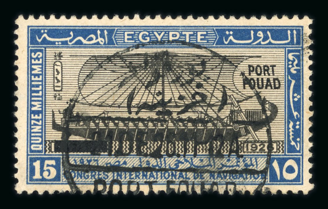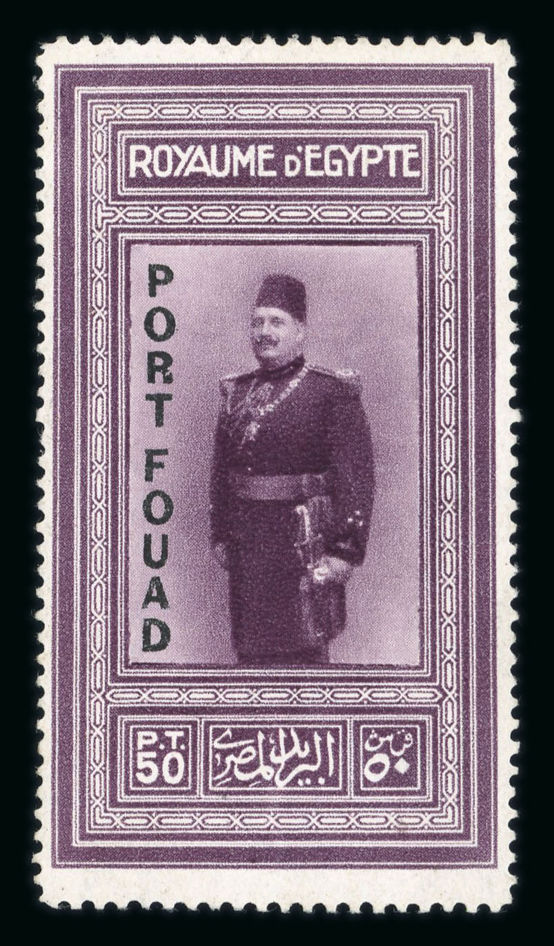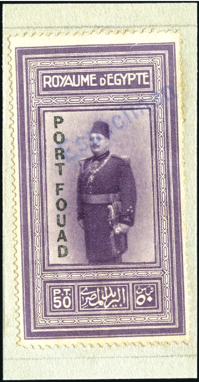 1927 Port Fouad 50pi purple mint nh single, showing left sheet marginal cancelled by PORT FOUAD/21.DE.26 first day cancel, showing blind perf., very fine and rare. (Image 1)
