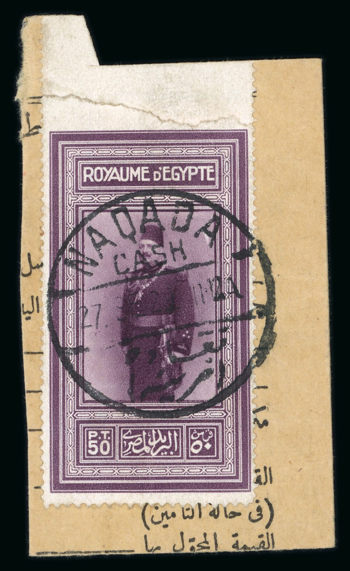 1926 King Fouad's Birthday 50pi purple, top marginal single imperforate at top, tear through margin, single tied on fragment by NAQADA/27.SE.29 cds, very fine and an extremely rare error, showpiece (NP C13g, $1'700) (Image 1)