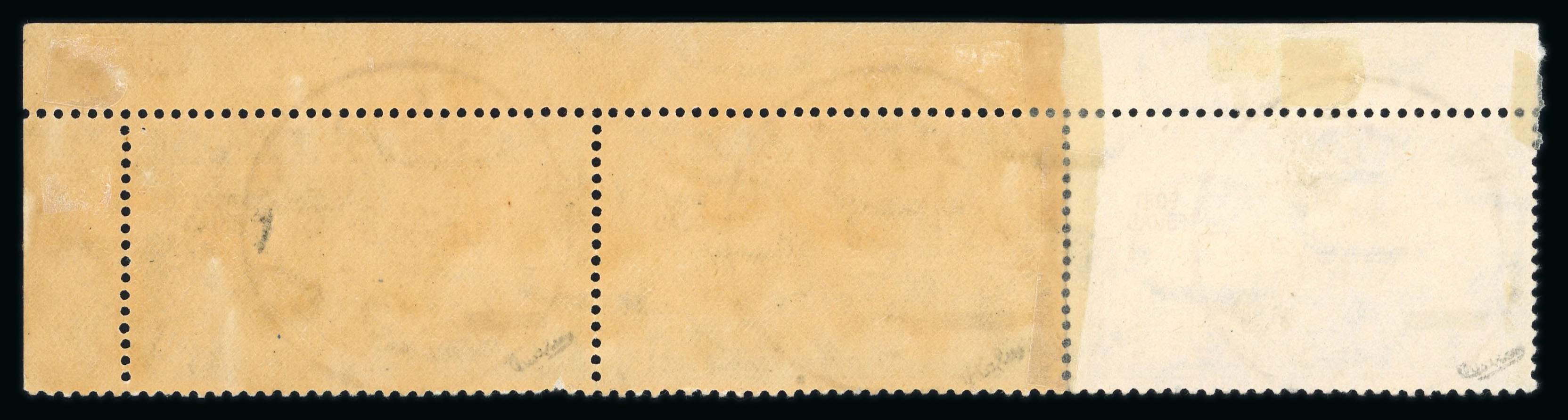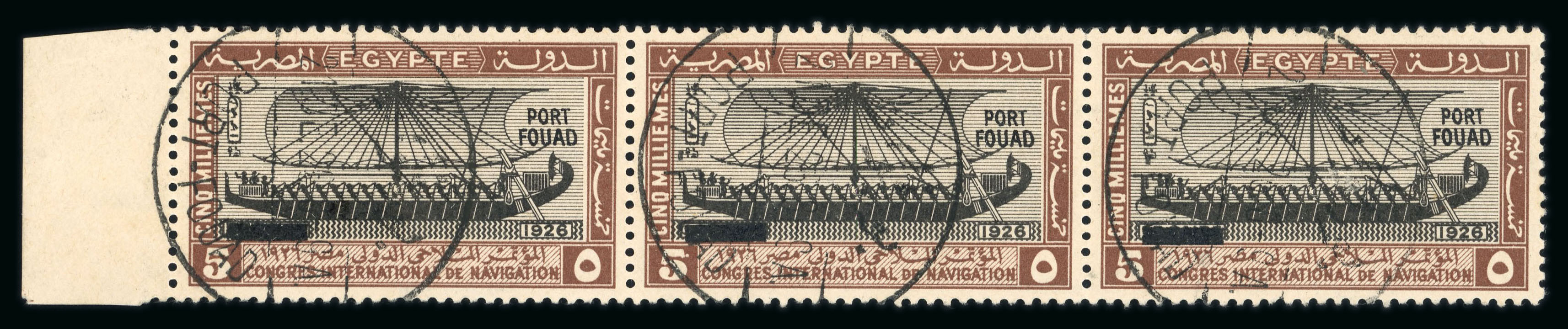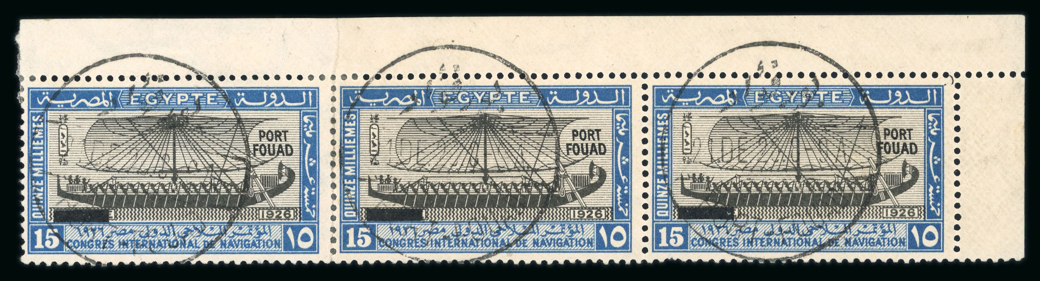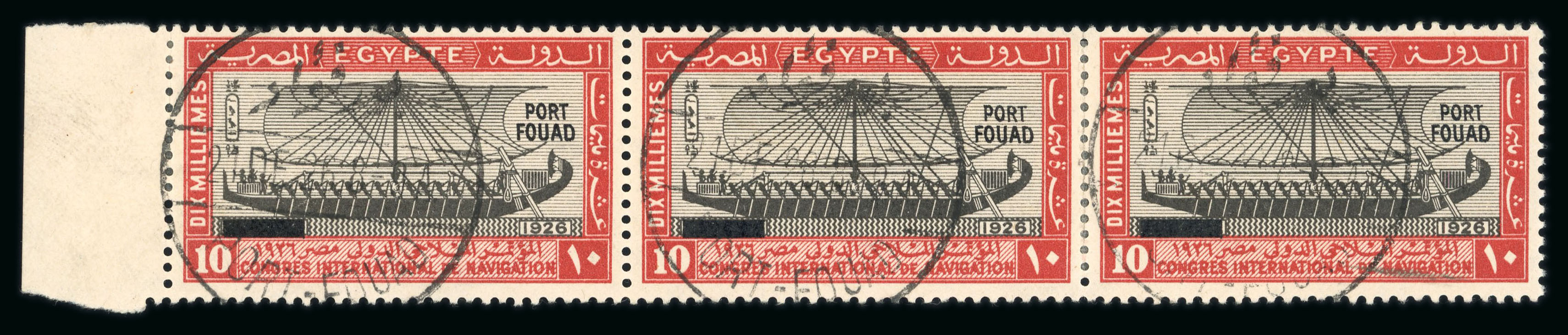 1927 Port Fouad complete used set of the three low values, all in horizontal strips of three and cancelled by PORT FOUAD/21.DE.26 first day cancels, a very fine and rare set (NP C17-C19, $2'250+) (Image 1)