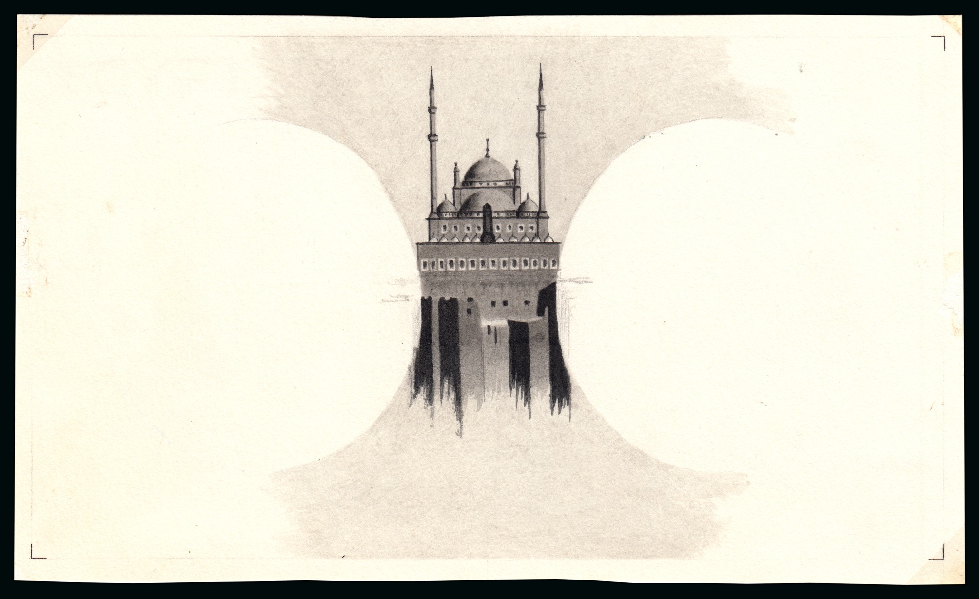 1941 Centenary of the Reigning Dynasty of Egypt (unissued) handpainted essay in black and grey of the Cairo Citadel between two blank vignettes, 165x99mm, unique essay (Image 1)