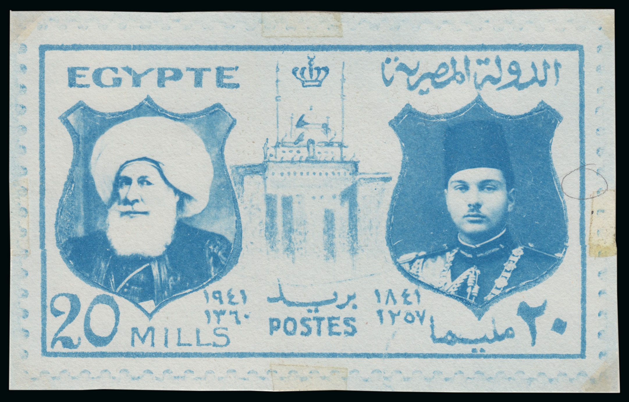 1941 Essays by the Survey Department for the Centenary of the Reigning Dynasty of Egypt (unissued), group incl. stamp-size essay on perforated card with painted background and legends with photographic cut-outs of Farouk and Mohamed Ali,