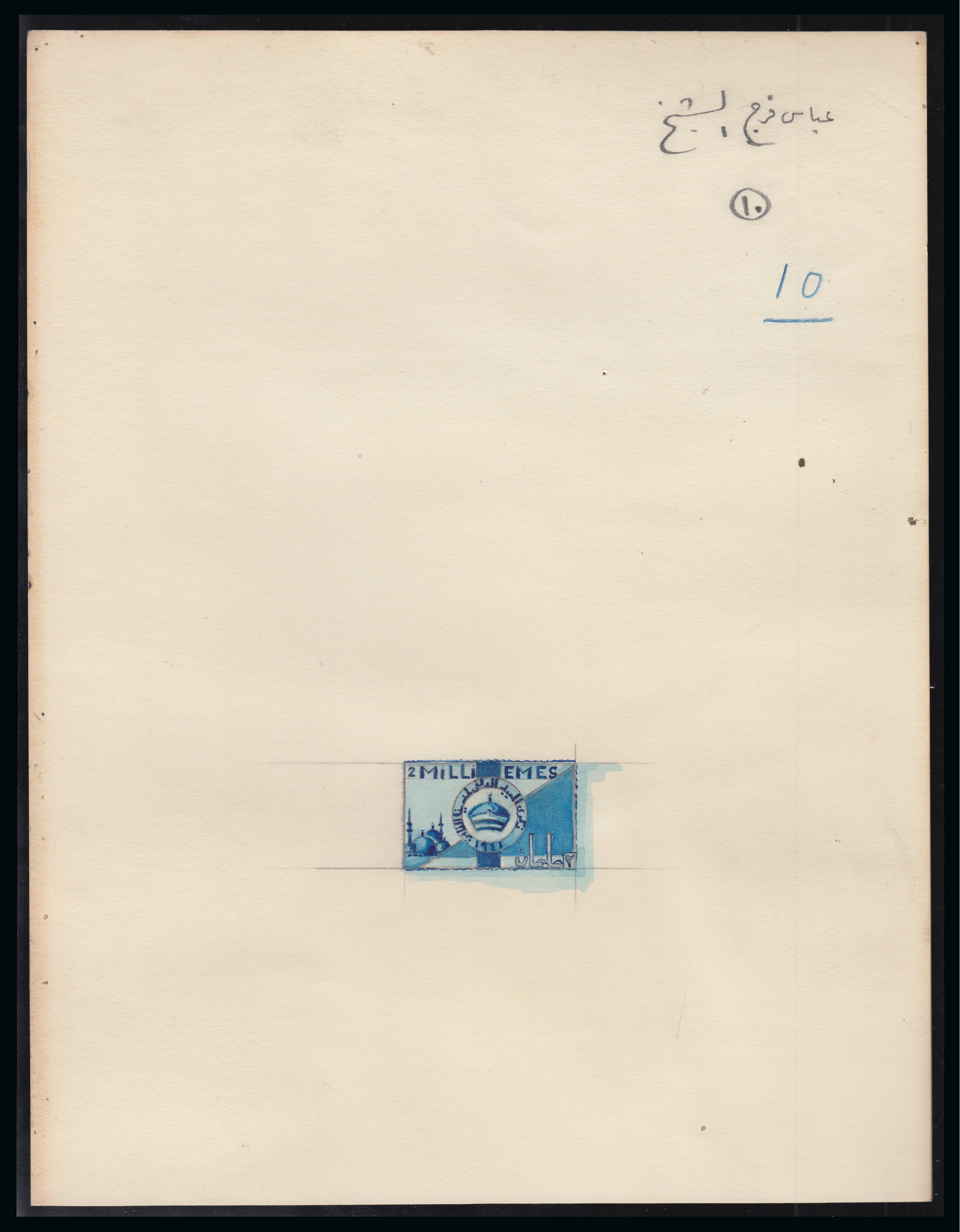 1942 Millenary of Al-Azhar University in Cairo, handpainted stamp size essay in blue-green ink, on large art card showing annotation in Arabic and numbered "1", very fine, attractive and unique (NP E499, $1'250). (Image 1)