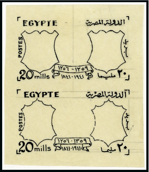1941 Centenary of the Reigning Dynasty of Egypt (unissued) pair of ink essays of two different frames on tracing paper, very fine and unique (NP E490) (Image 1)