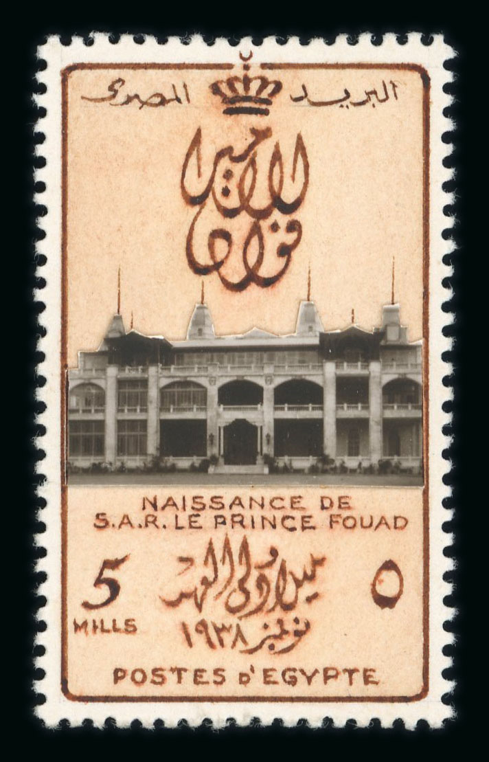 1938 Essay by the Survey Department for the birth of Farouk and Farida's first child (unissued), stamp-size essay on card, perforated, with handpainted background, value and legend with photograph picture of the palace, a unique item. (Image 1)