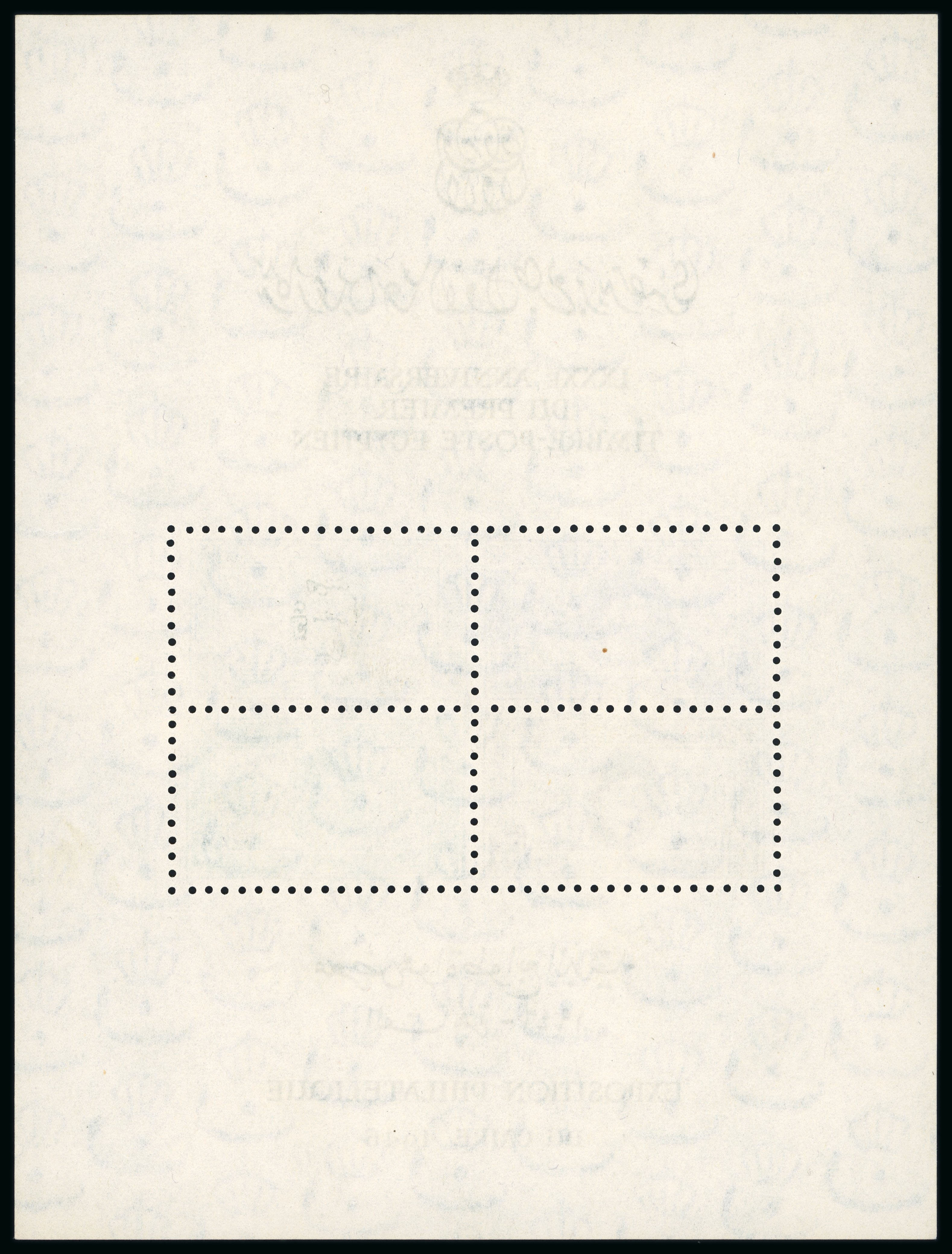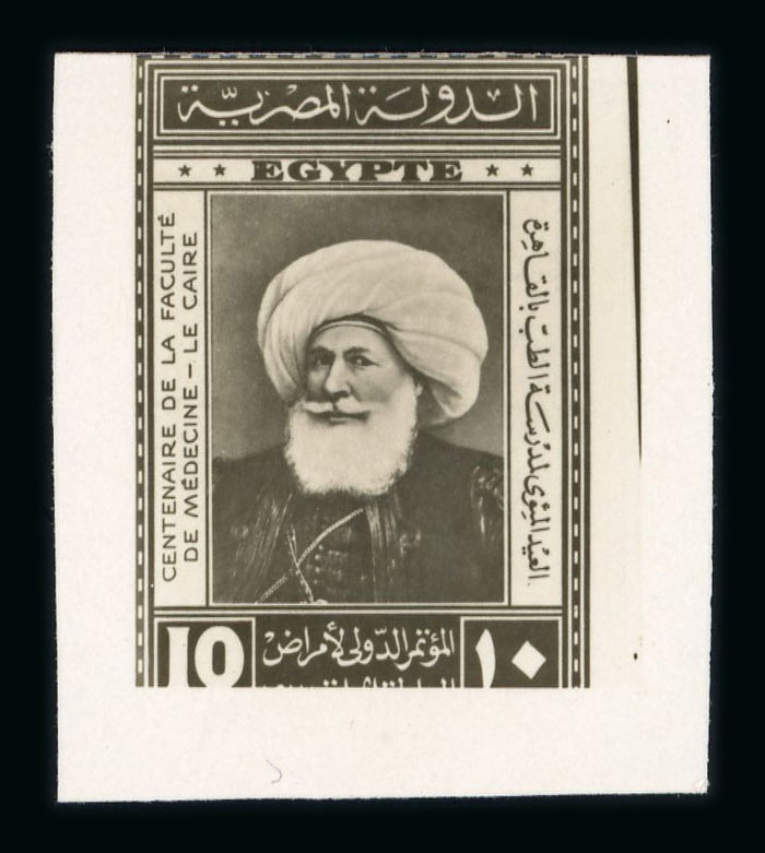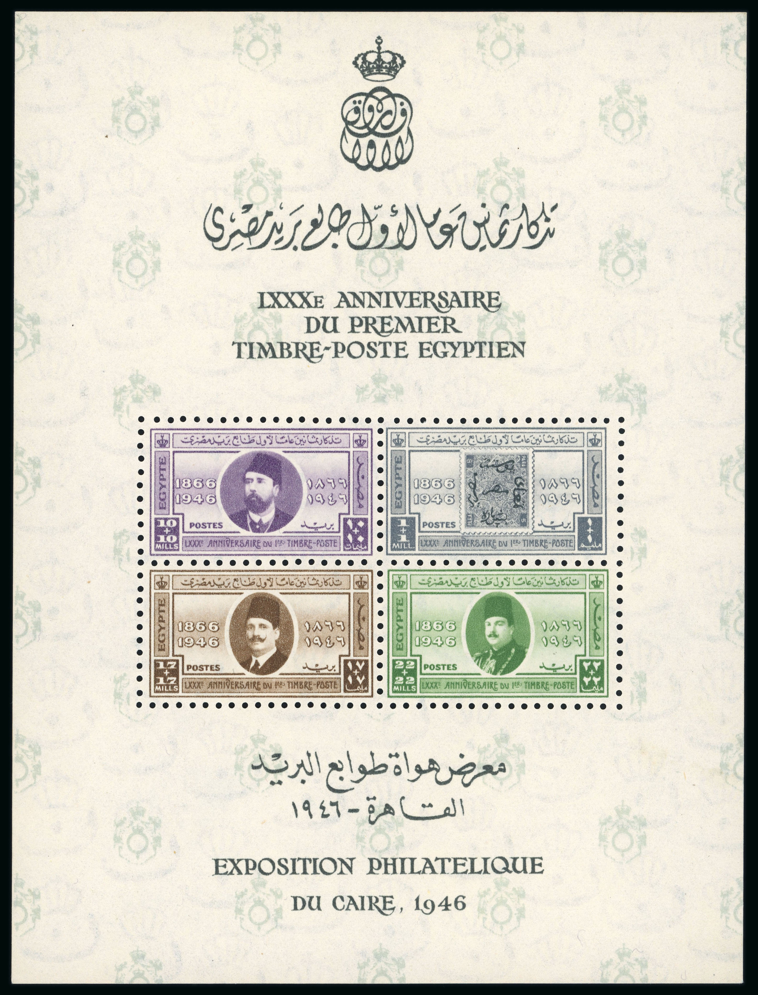 1946 Anniversary of Egypt's First Postage Stamp mint n.h. perf. and imperf. miniature sheet proofs showing large Crown and Arabic F watermark variety, very fine and very rare. (Image 1)