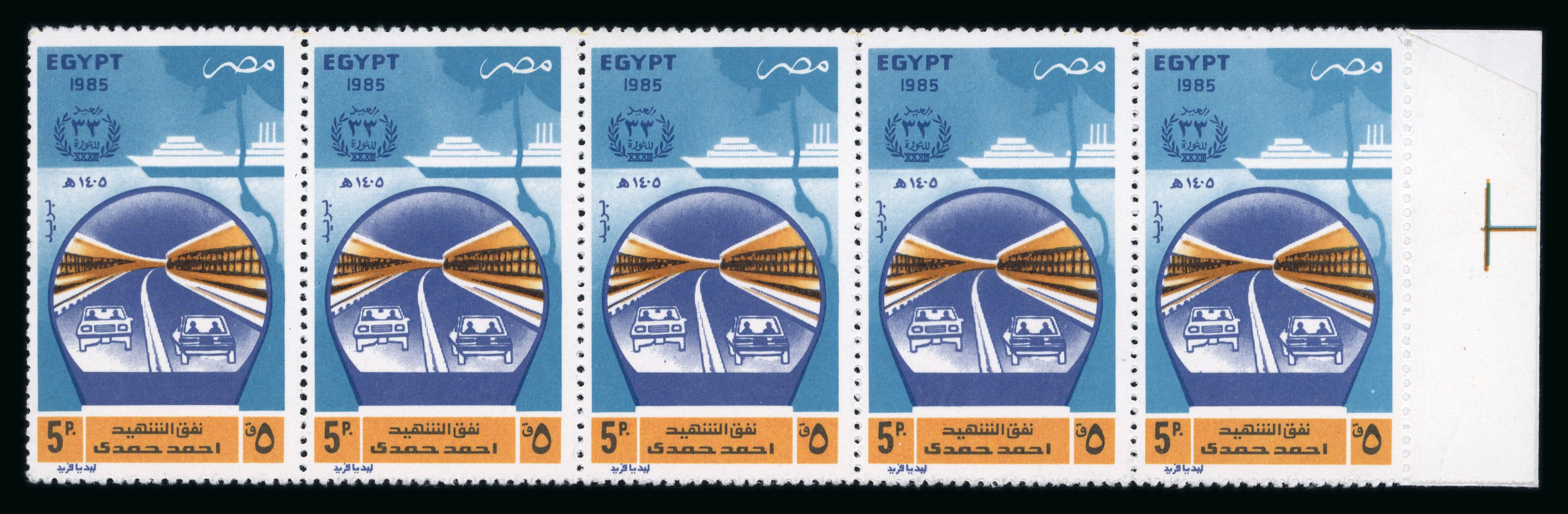 1955-56 25m violet, mint nh block of four show dramatic misplacement of Palestine ovpt in red, fresh, very fine and scarce. (Image 1)