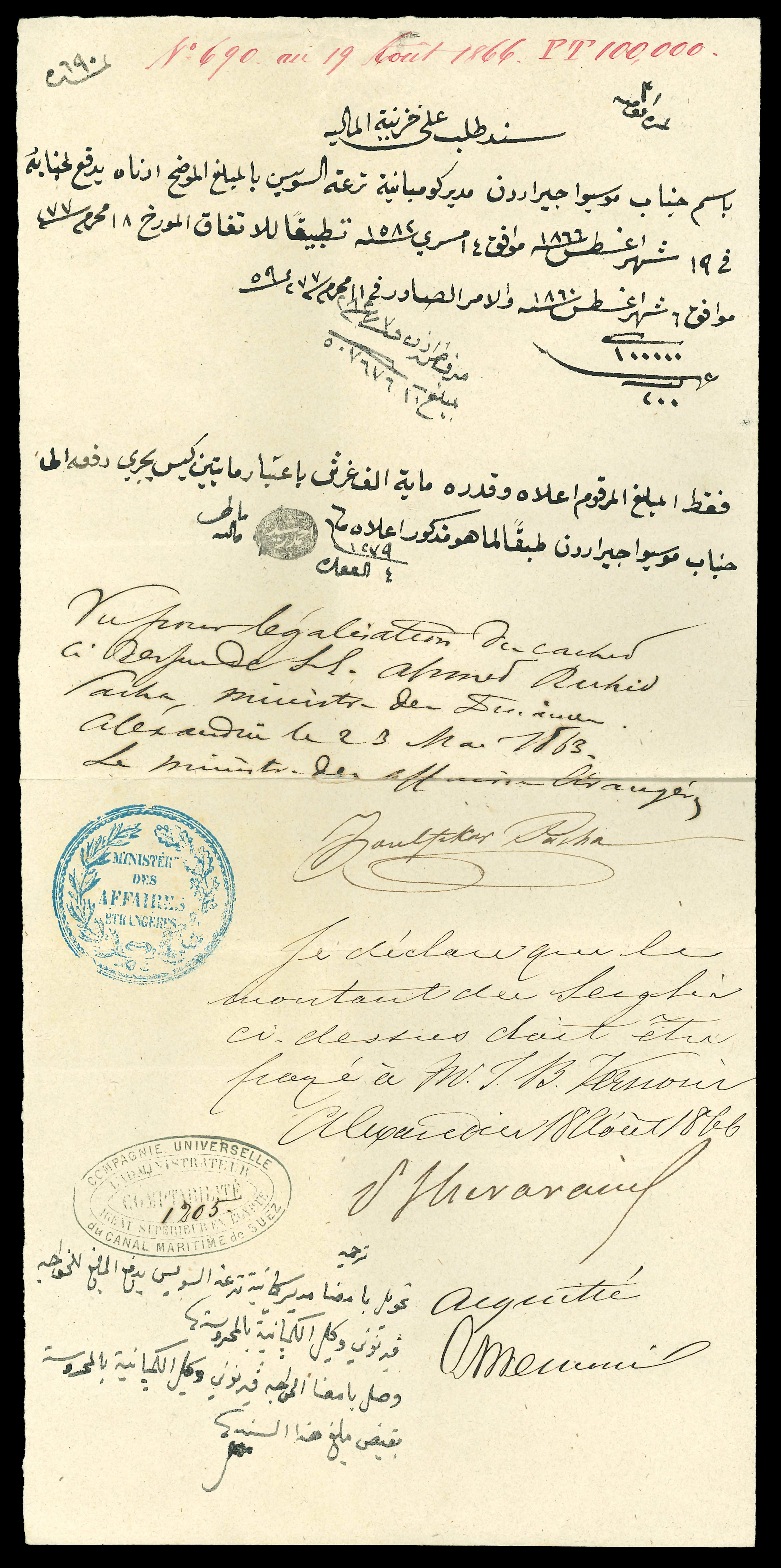 1866 Suez Canal bond no.690 for 100'000PT, handwritten document signed by Ahmed Rashed Pasha, Minister of Finance, for payment to Mr Gerard, Manager of the Suez Canal Company, with the handstamps of both at foot, very rare historical