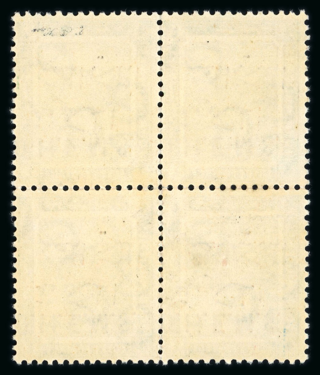 oblique, mint n.h., and 1991 30pi dark violet block of four showing a major perf. shift, some light browning to bottom left stamp but otherwise fine. (Image