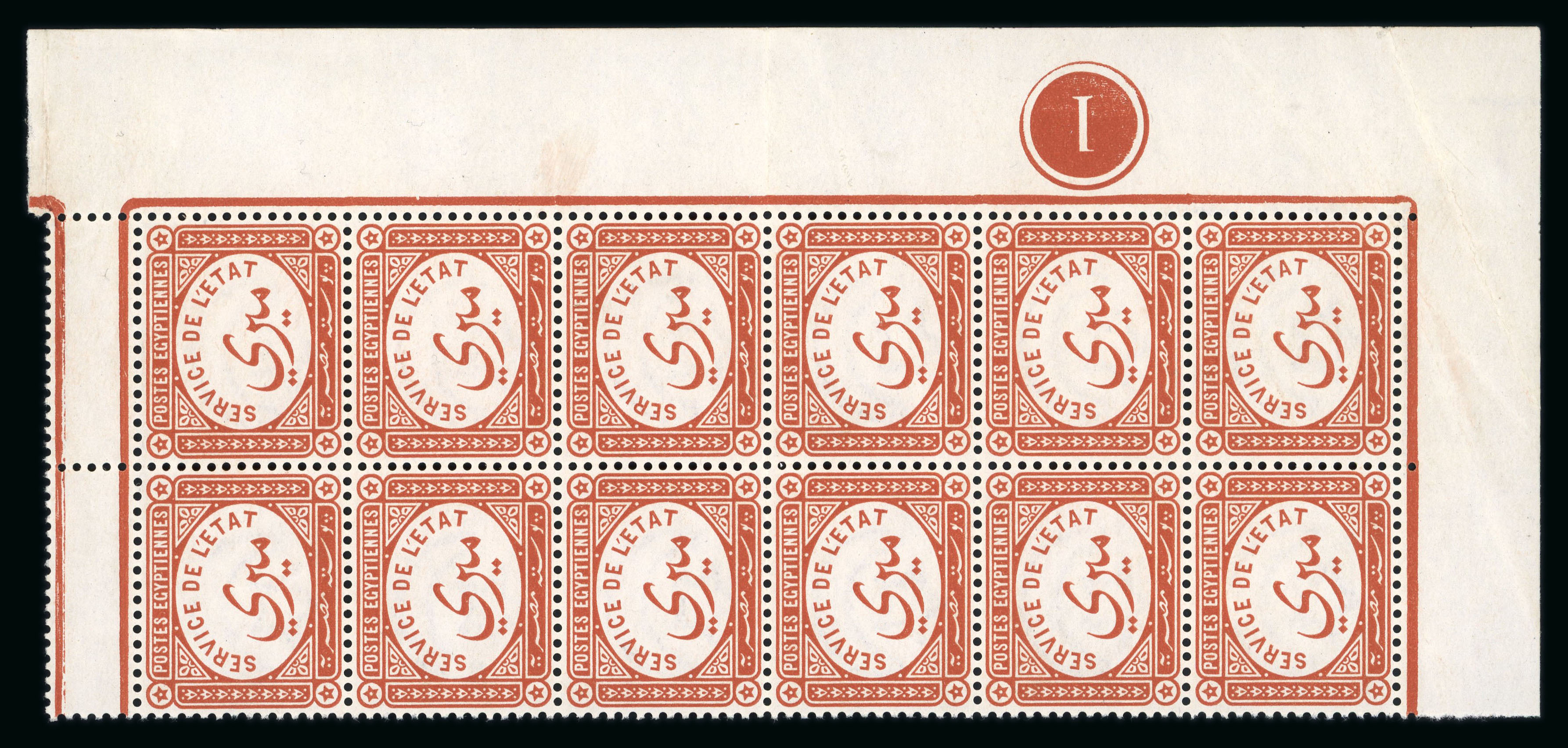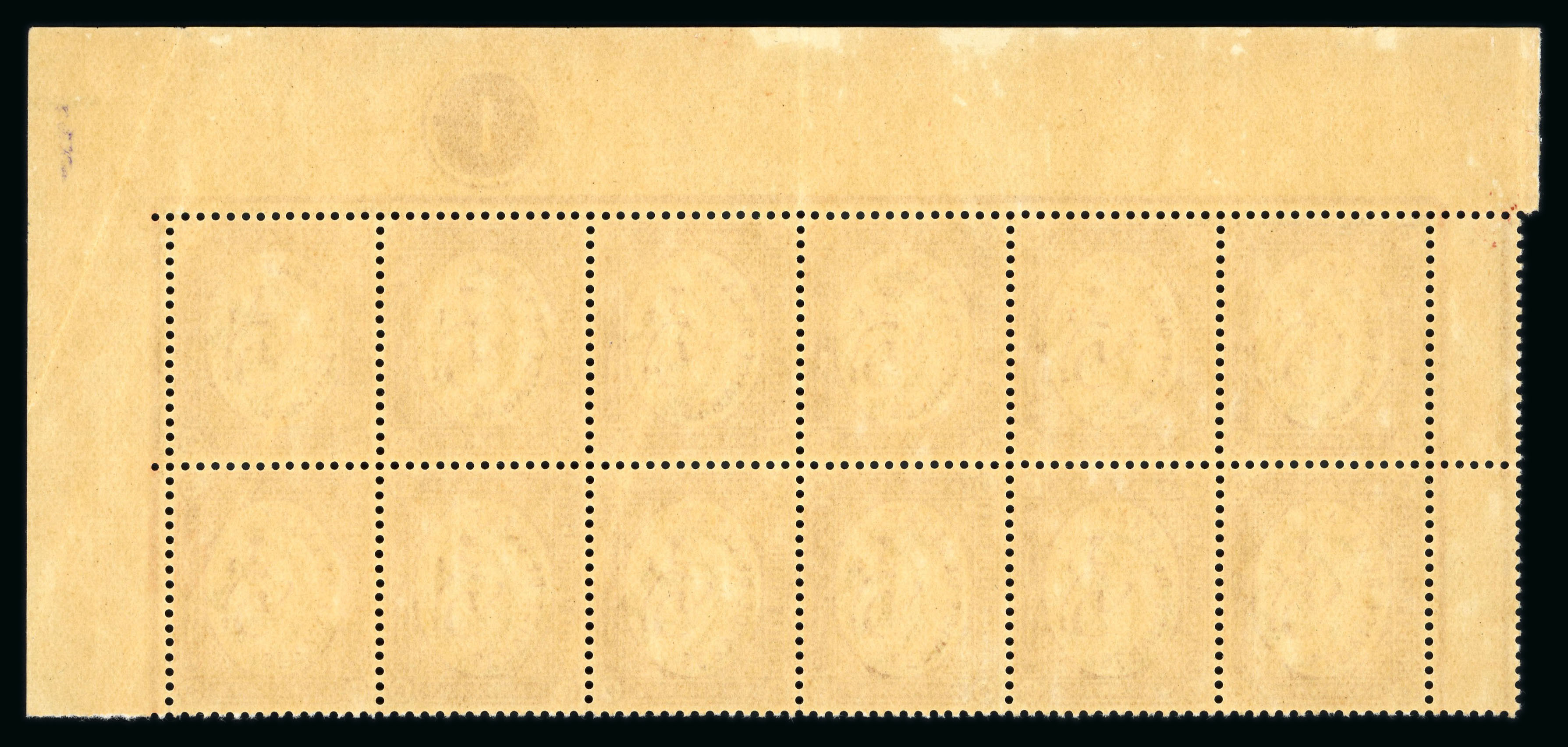 1893 No Value Official in chestnut in mint n.h. bottom right corner sheet marginal control number "1" block of 12 with inverted watermark, showing Jubilee bars on three sides, fresh, very fine and a rare positional multiple. (Image 1)