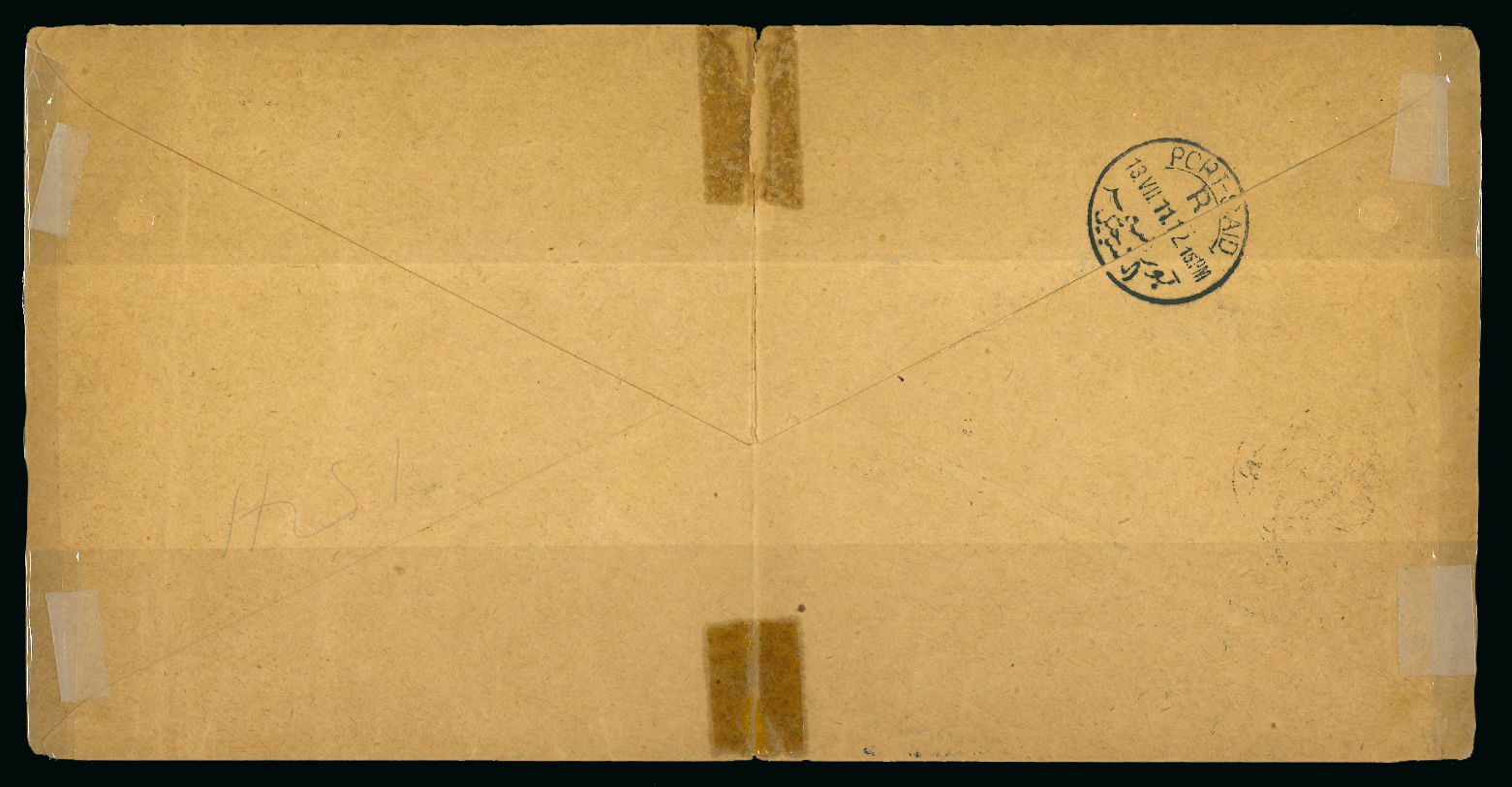 1893 (-) Chestnut and 1907 5m rose-carmine, on enlarged 1911 OHHS registered envelope from Giza to Port Said, tied GIZA/SUCCURSAL cds with similar alongside, cvr crease, a fine usage. (Image 1)