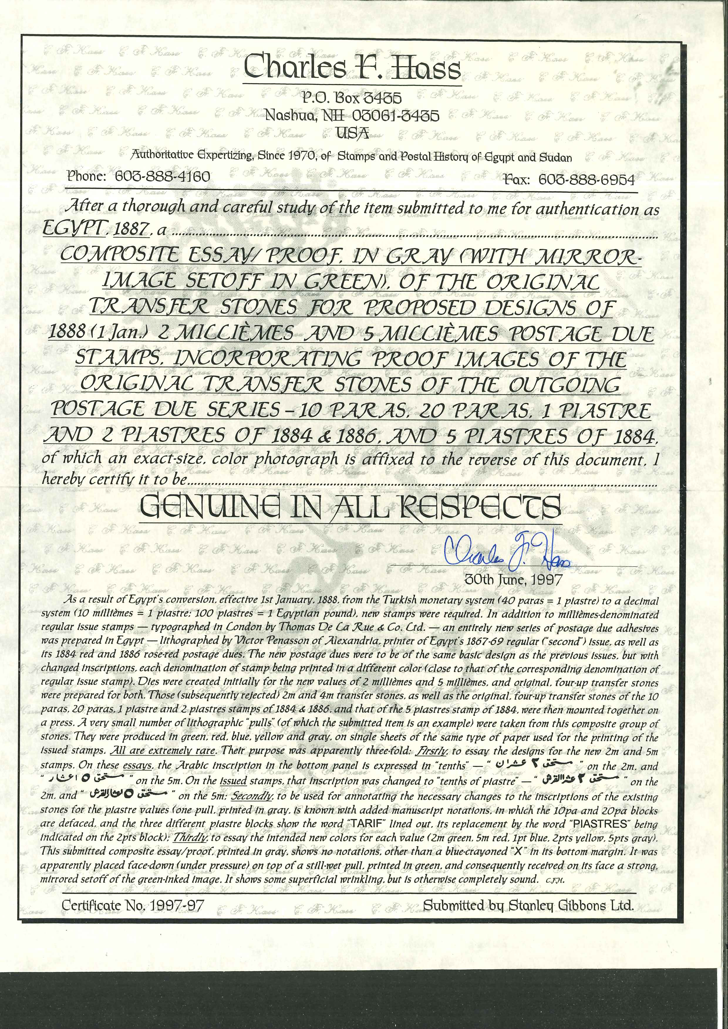 1907ca. Essay of surcharge "3 Millièmes." on 2pi postage due, mint n.h., small wrinkle at lower right, fine and scarce; cert. Hass (1990); ex Peter Smith (NP E149, $450). (Image 1)