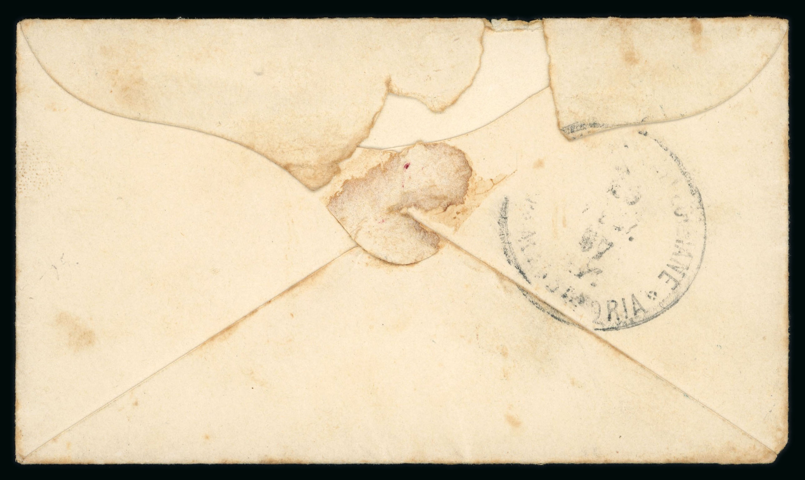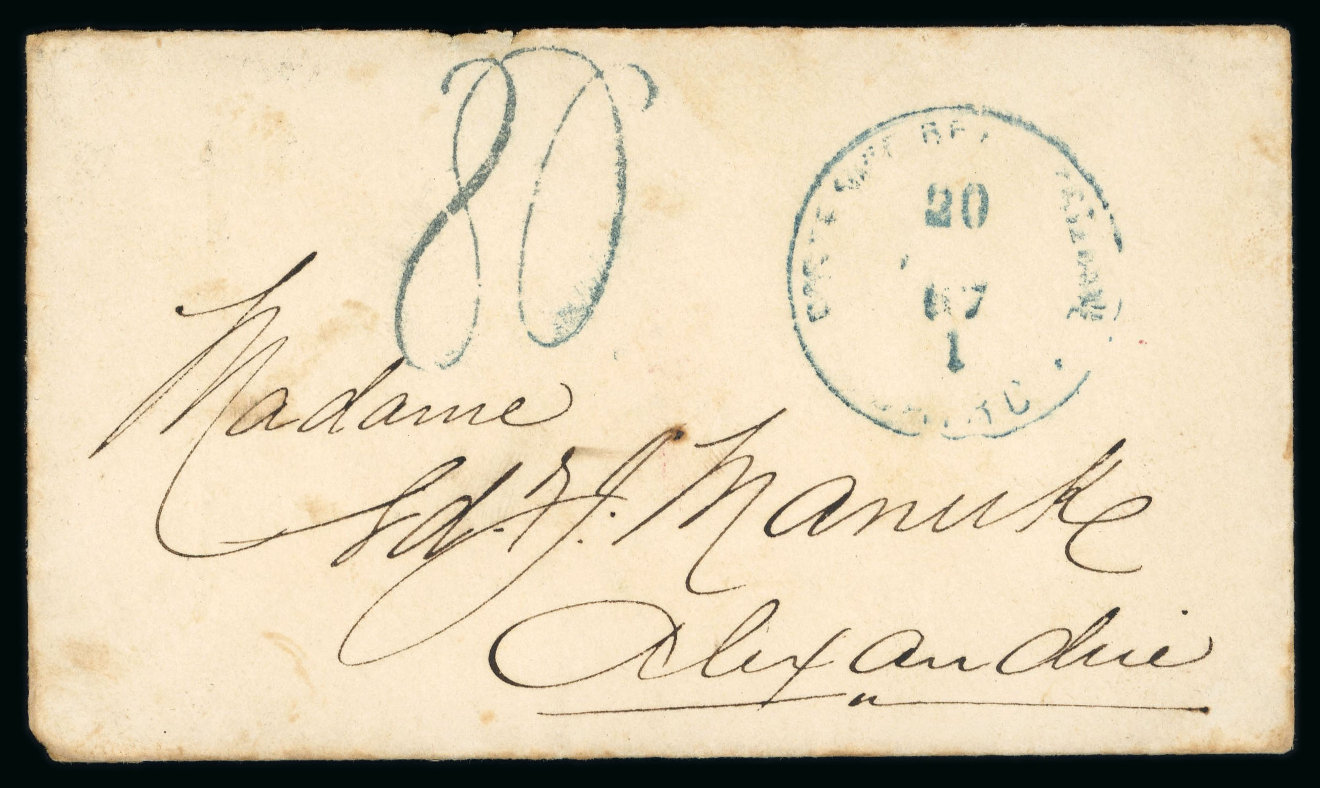 1867 Small neat envelope from Cairo to Alexandria, bearing Cairo departure in blue with "80" handstamped due marking alongside, Alexandria arrival bs, fine and scarce due mkg prior to the arrival of postage due stamps in 1884 (Image 1)