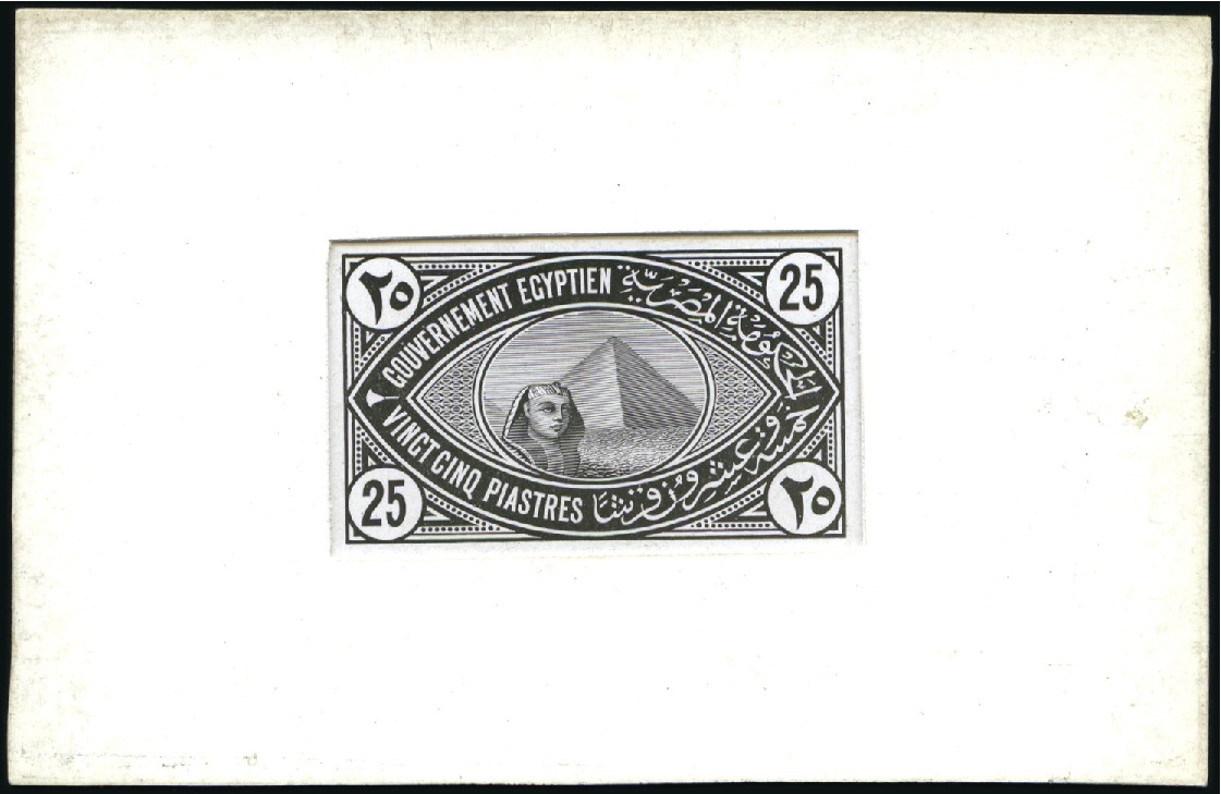 1923-24 De La Rue die proof for the 17c value in red showing silhouette of Pyramids, on ribbed paper mounted on card, very fine and extremely rare. (Image
