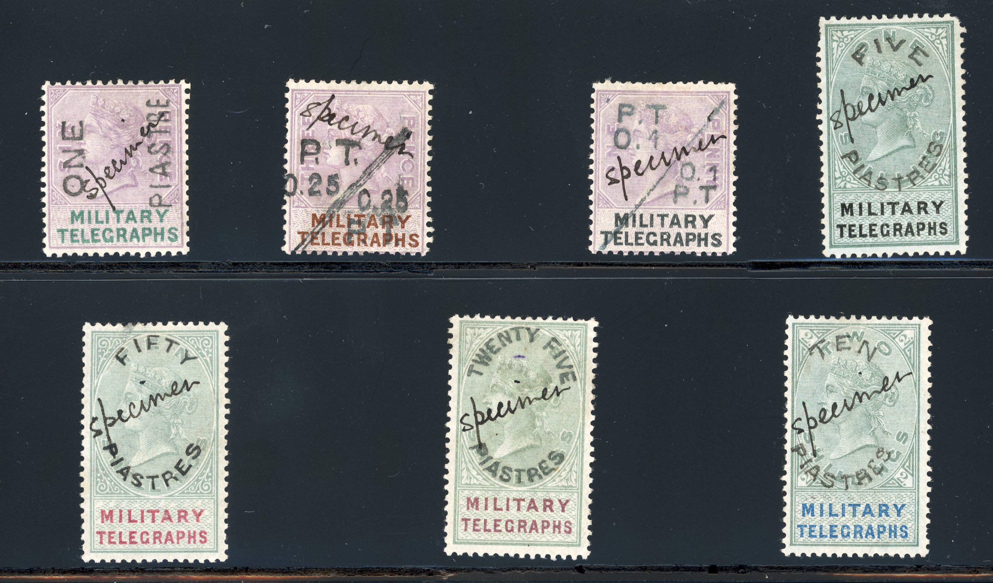 Military Telegraphs: 1886 10pa to 50pi part unused set of seven with manuscript SPECIMEN, perf and gum faults, scarce. (Image 1)
