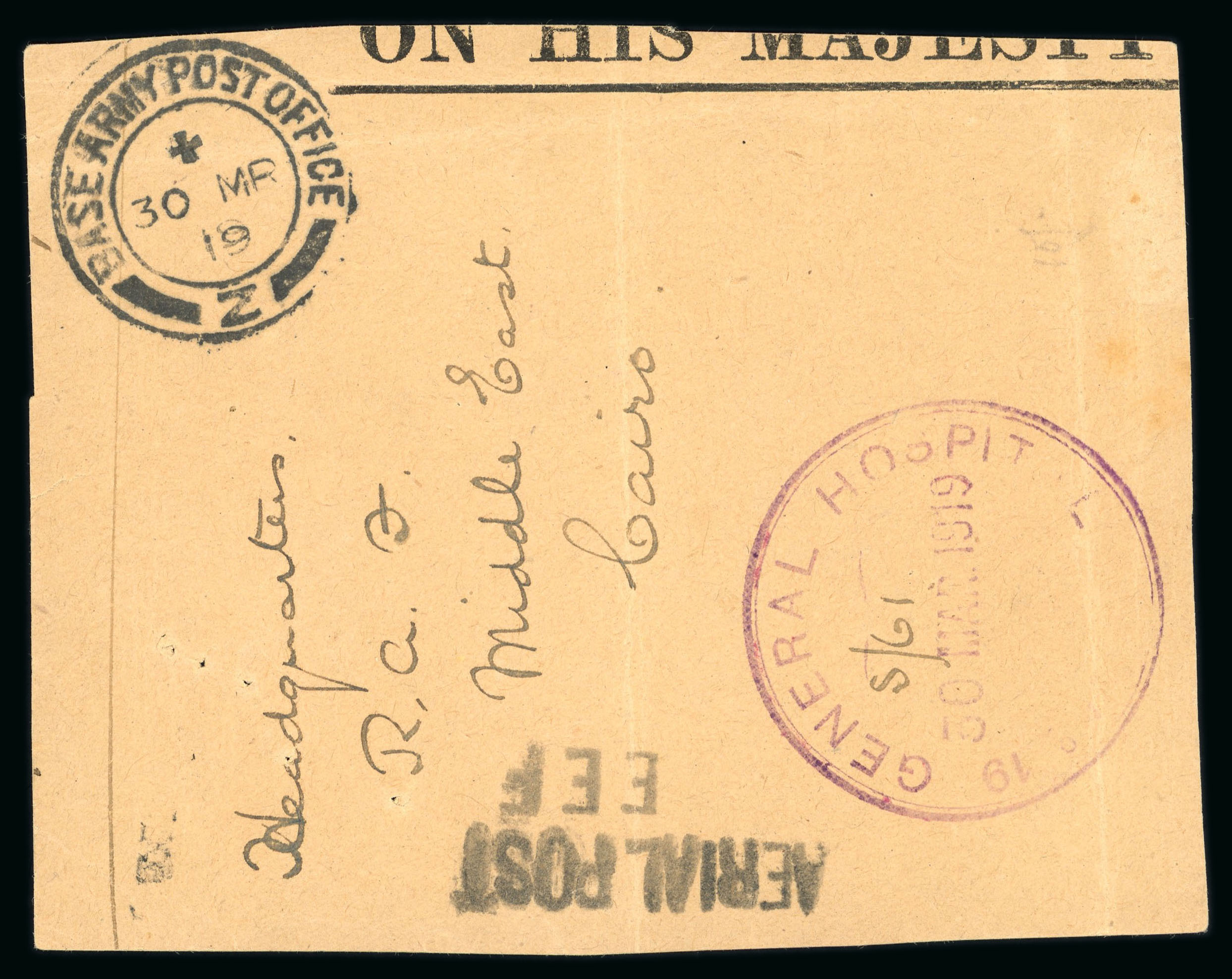 1919 Emergency EEF Airmails. Two OHMS covers and one part cover, showing two different AERIAL POST E.E.F. markings, two unframed in black and the other large framed violet cachet, a fine and scarce. (Image 1)