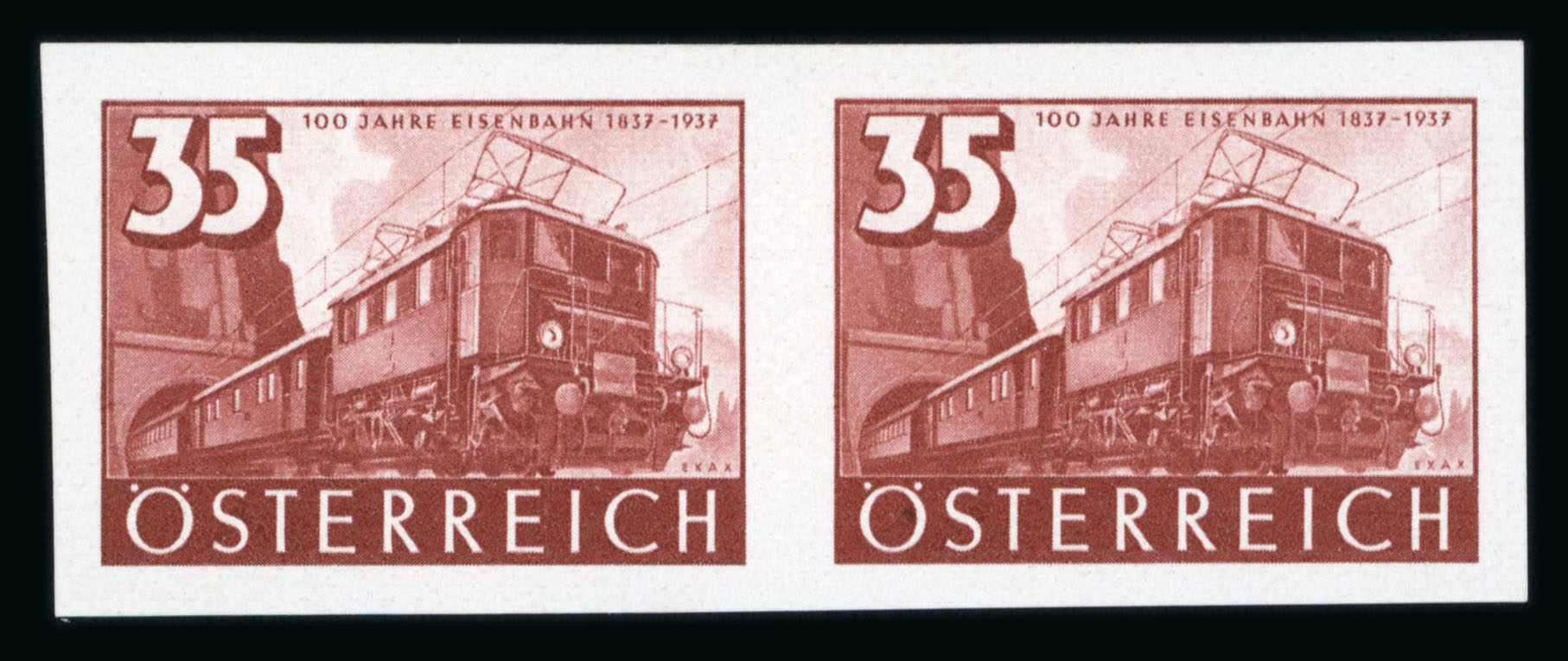 1937, 100 Jahre Eisenbahn in UNGEZÄHNTEN postfrischen Paaren, sehr gute Erhaltung und selten, zarte kleine Bleistiftsignatur Matl, Attest Soecknick, ANK und Mi 646U-48U. (Image 1)