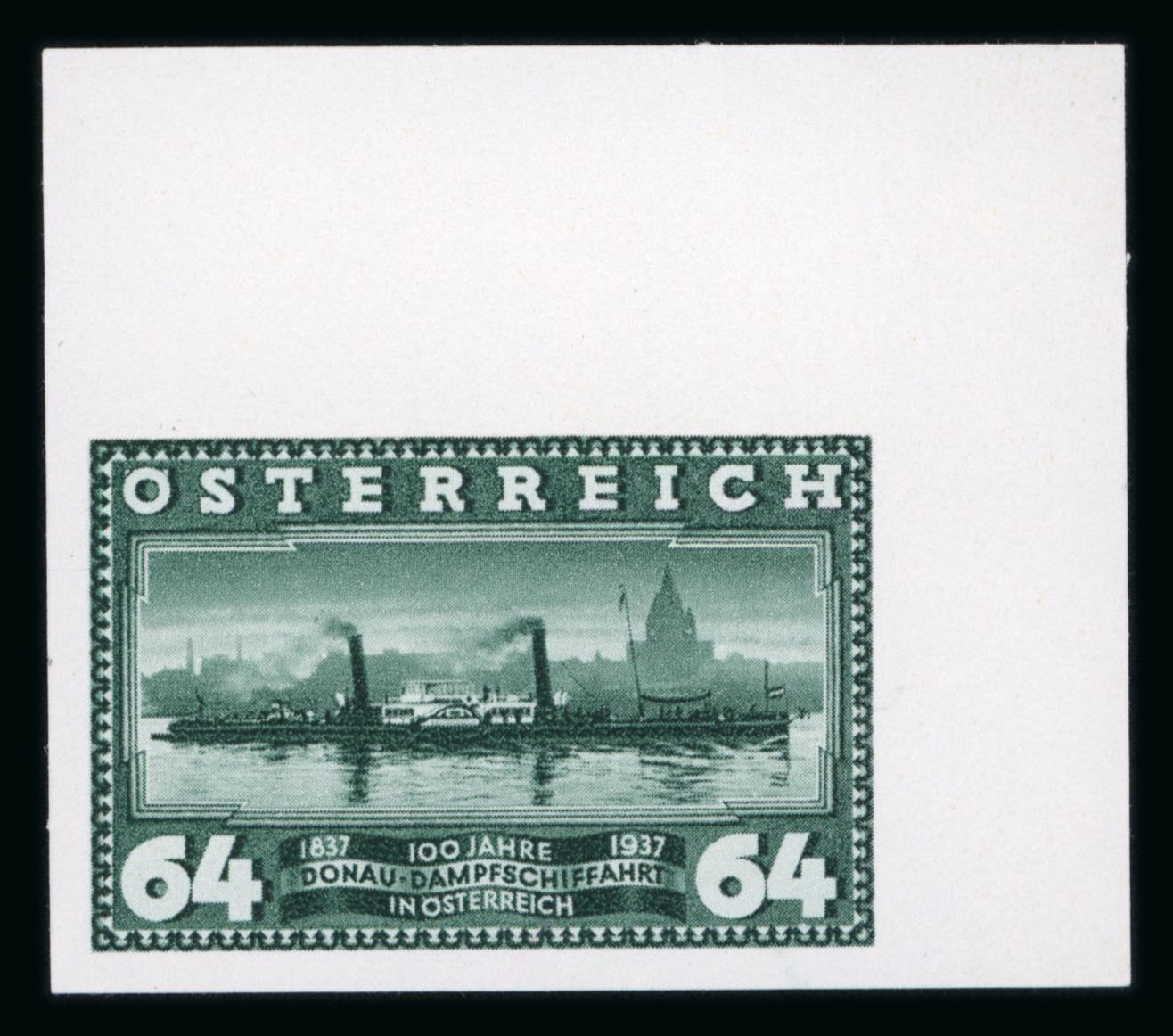 1937, 100 Jahre DDSG Dampfer Maria Anna, UNGEZÄHNTE rechte obere Eckrandstücke auf ungummiertem Papier, sehr selten, Attest Soecknick, ANK und Mi 639U-41U, (ANK € 4500 für postfrisch?). (Image 1)