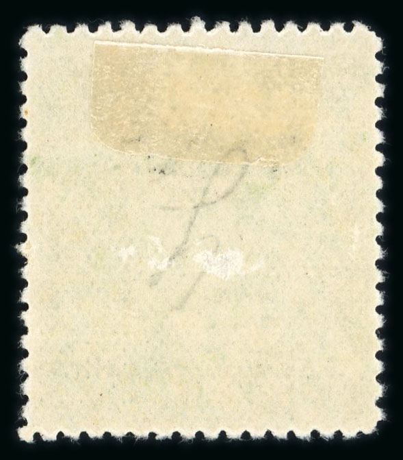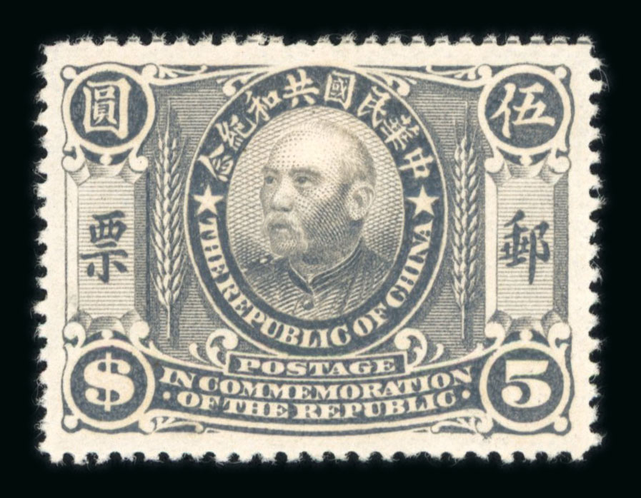 China 1913 London printing 20c Reaper, a bottom right corner marginal shoeing a spectacular plate crack which runs from top right of stamp, through the stamp and into bottom margin, a truly spectacular item, fresh hinged mint (Image 1)