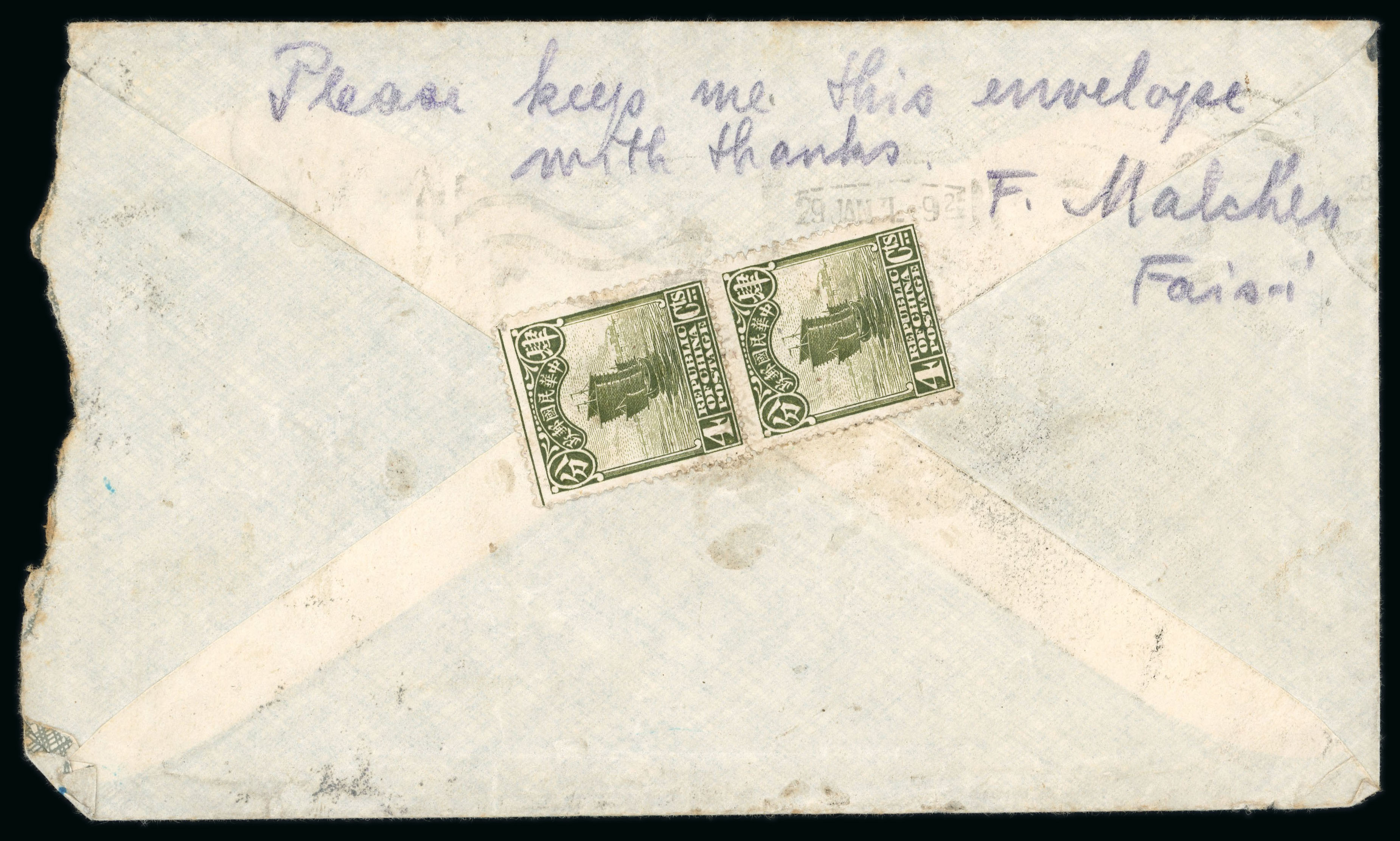 1930s envelope sent to Shortlands, British Solomon Islands franked on reverse three 1c on 3c Junks with indistinct cancel, plus an envelope from Canton to The Associated Plantation Ltd at Choiseul Bay, in British Solomon Islands with one