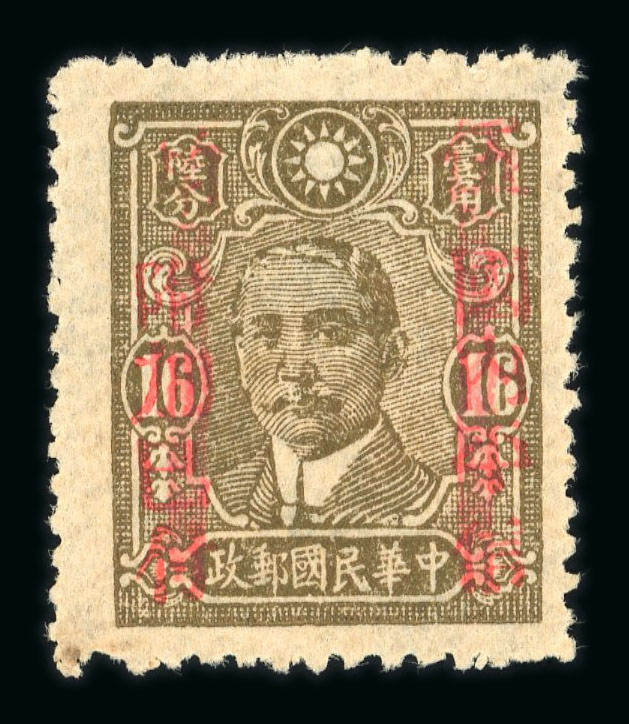 1942 Provincial surcharges on 16c. Sun Yat-sen with red Kansu overprint unused without gum, with 1943 50c re-surcharge for comparison. (Image