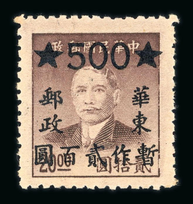 Jiangsu 1949 $500 on $20 Sun Yat-sen error of surcharge unused without gum as issued, very fine and scarce. (Image 1)