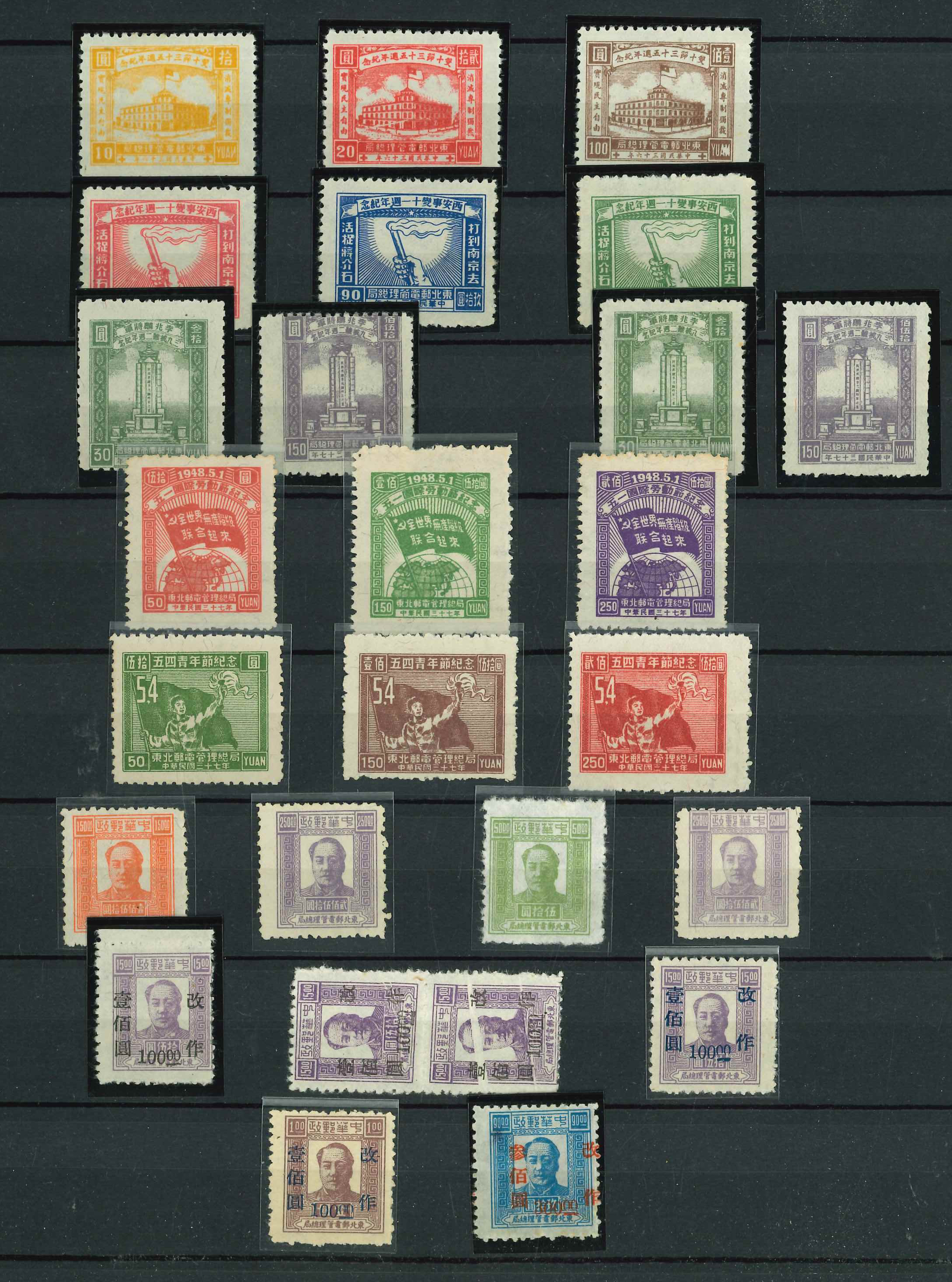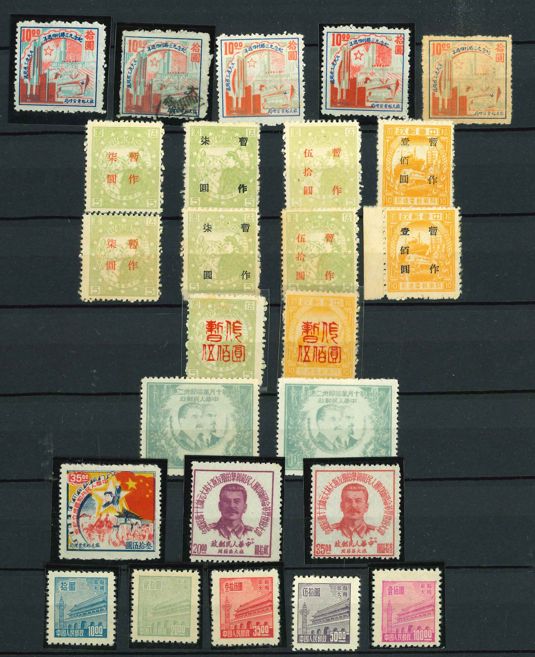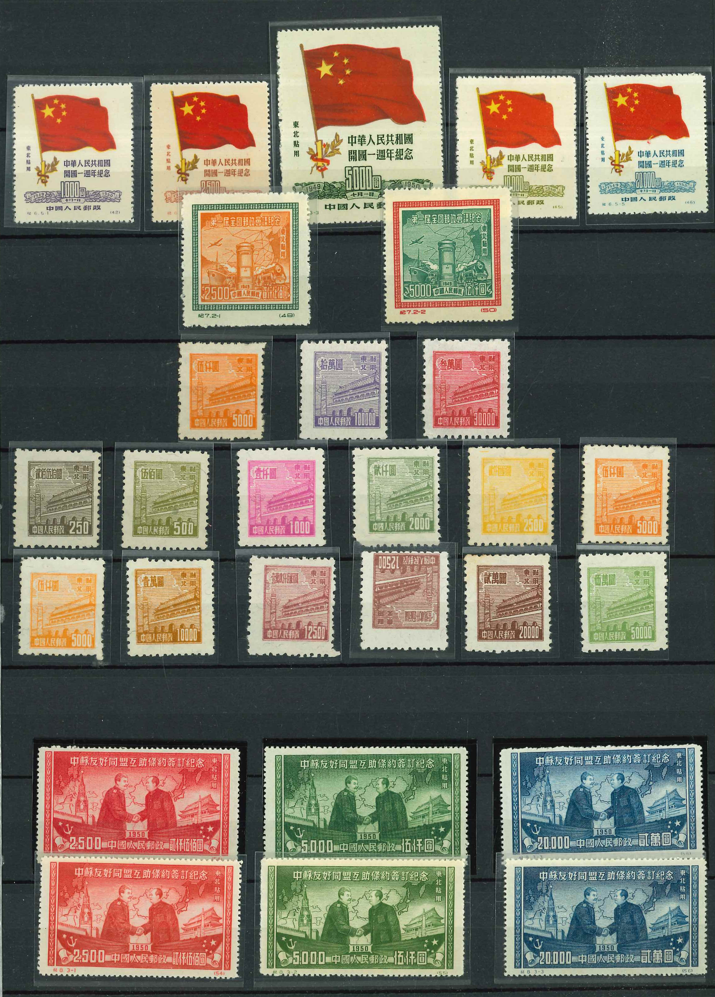 1949 North China People’s Post, 4 stock cards with nearly complete range from SG NC258, incl. some better complete sets, incl. SG NC327A-NC333A, NC 327B-NC333B; unused, very fine. (Image 1)