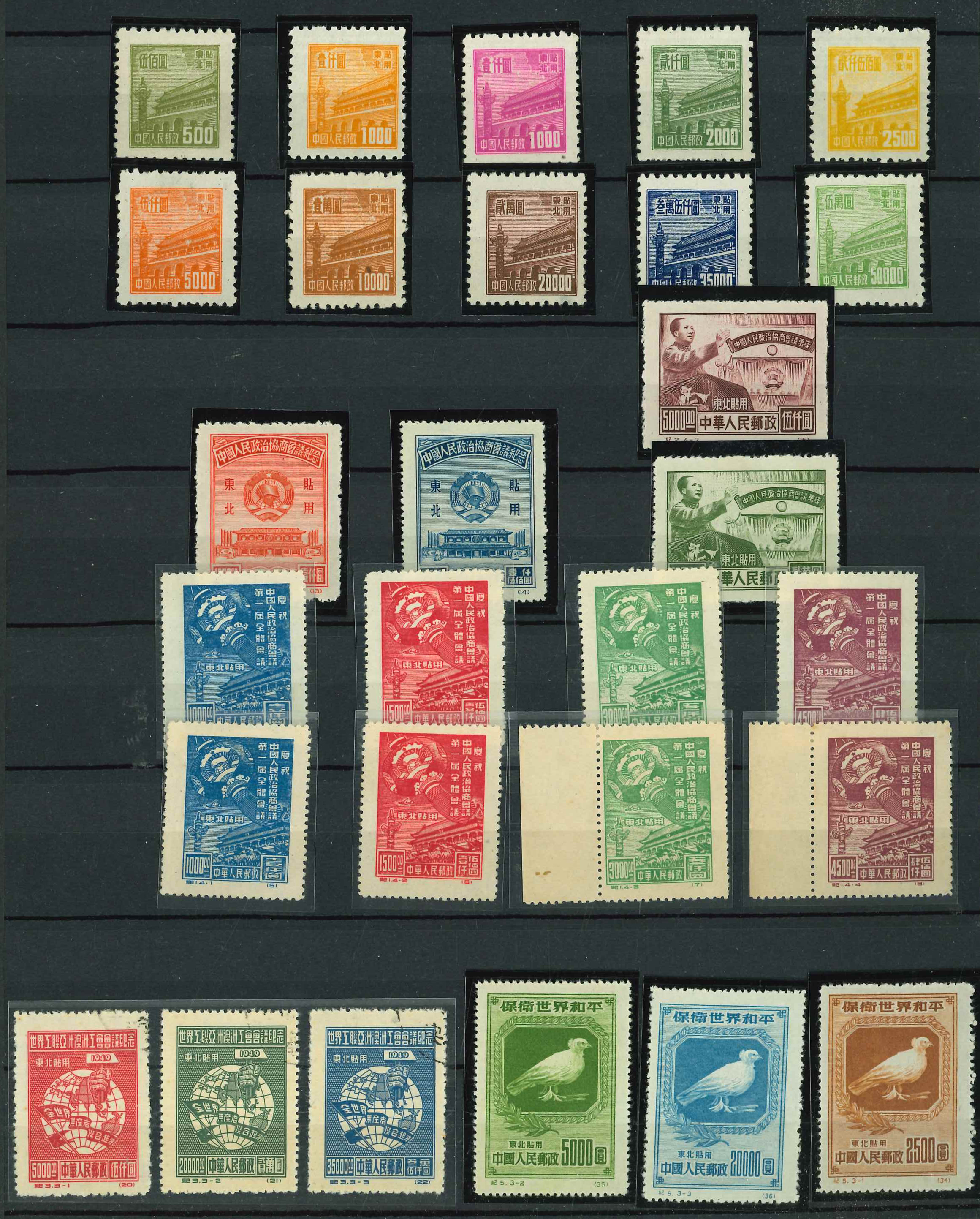 North East China People’s Post, 11 album pages, ranging from SG NE133; incl. NE162-68 perforate and imperf, with inverted surcharge NE268a, NE218 in vertical pair with paper folds (with Ed. Boers certificate), all unused. (Image 1)