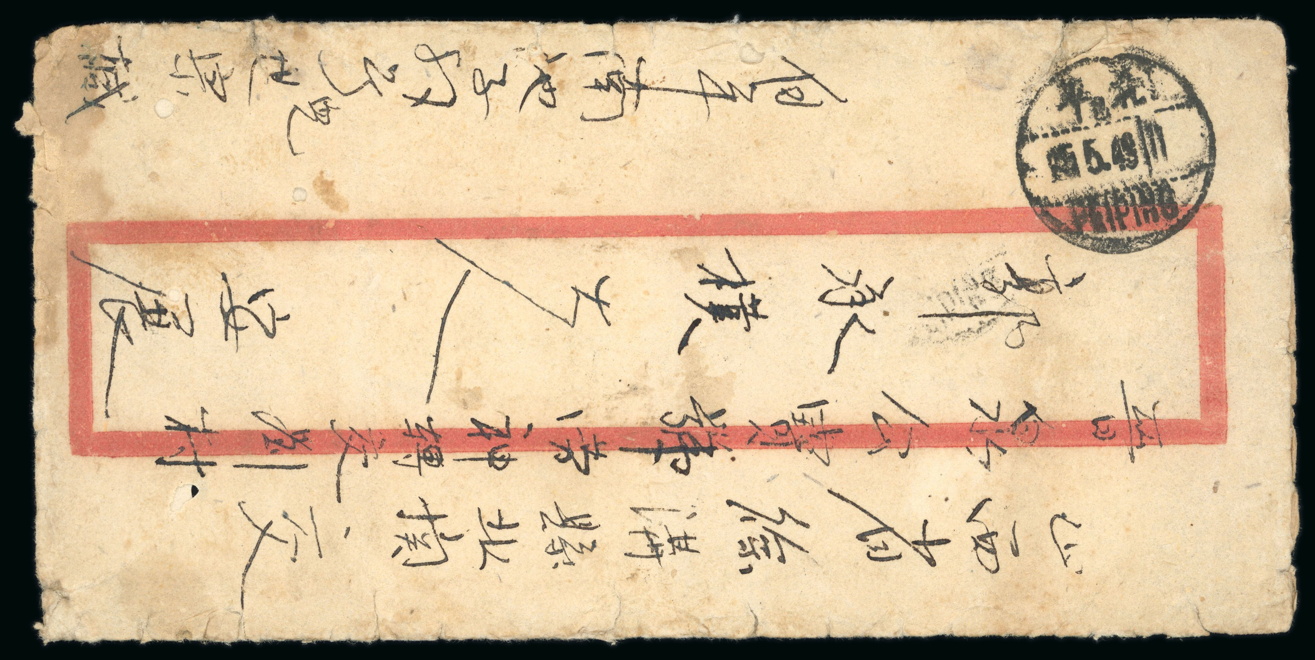 1949 (25.5.) red band envelope to Su-Kow franked on reverse 'People's Postal Service North China' $6 on $10 (3) and $2 on 20c tied by two cds, repeated on front, arrival cancel alongside, some staining and peripheral faults, a scarce