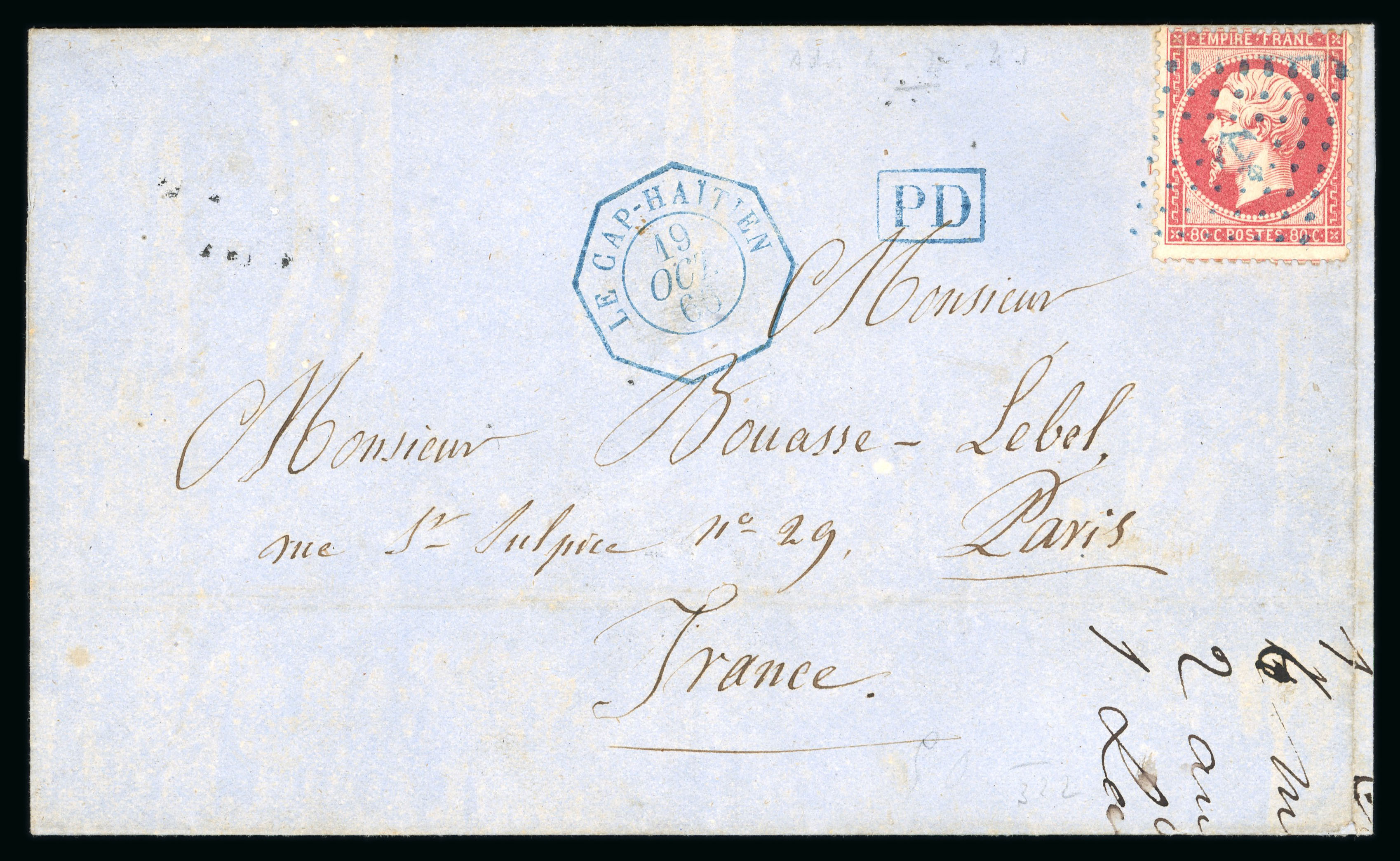 1866 (19 Oct) entire to Paris bearing single franking 1862 80c. Napoleon tied blue 'lozenge and anchor', Le Cap Haitien octagonal date stamp and small framed PD in association, maritime cds on reverse together with arrival. (Image 1)