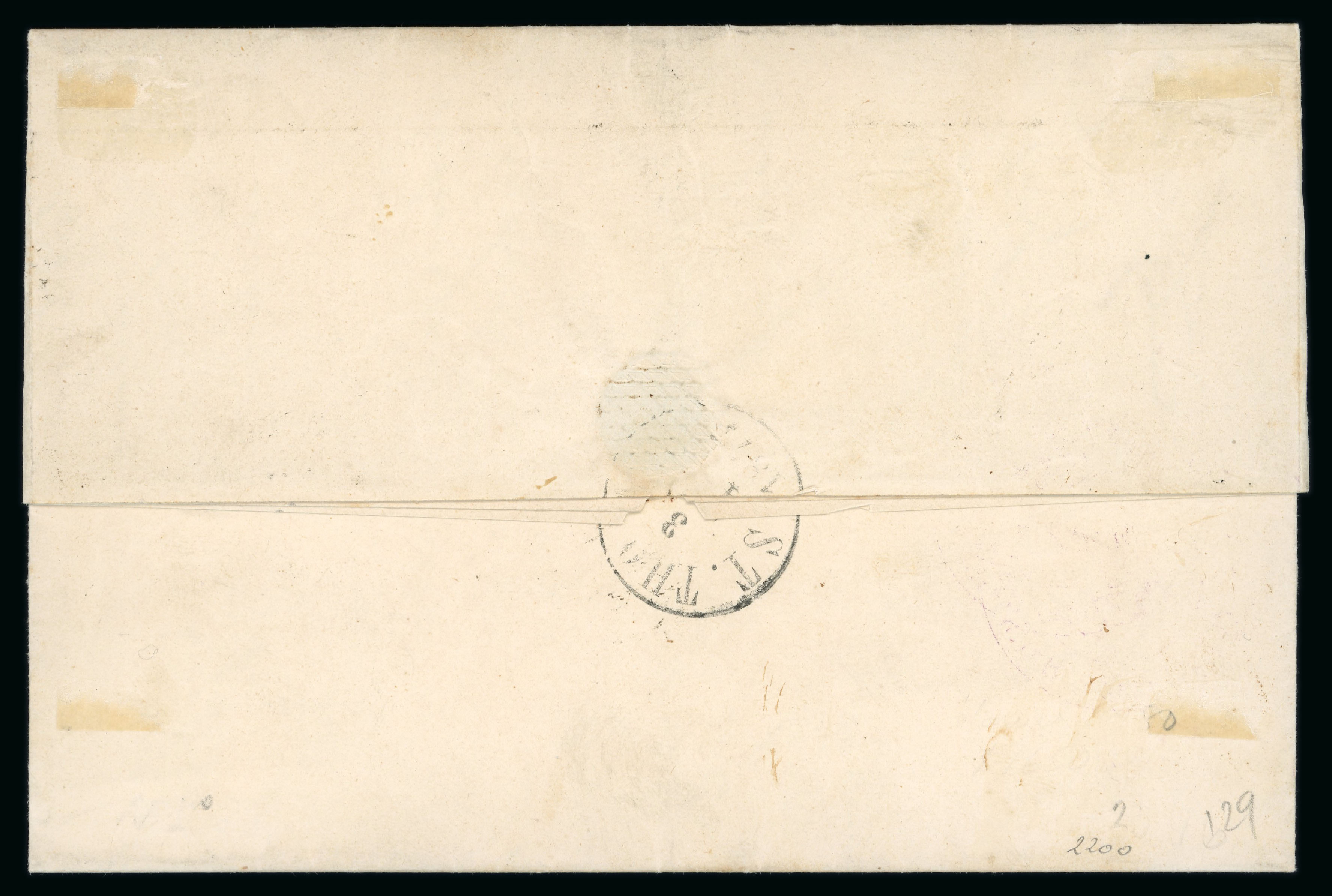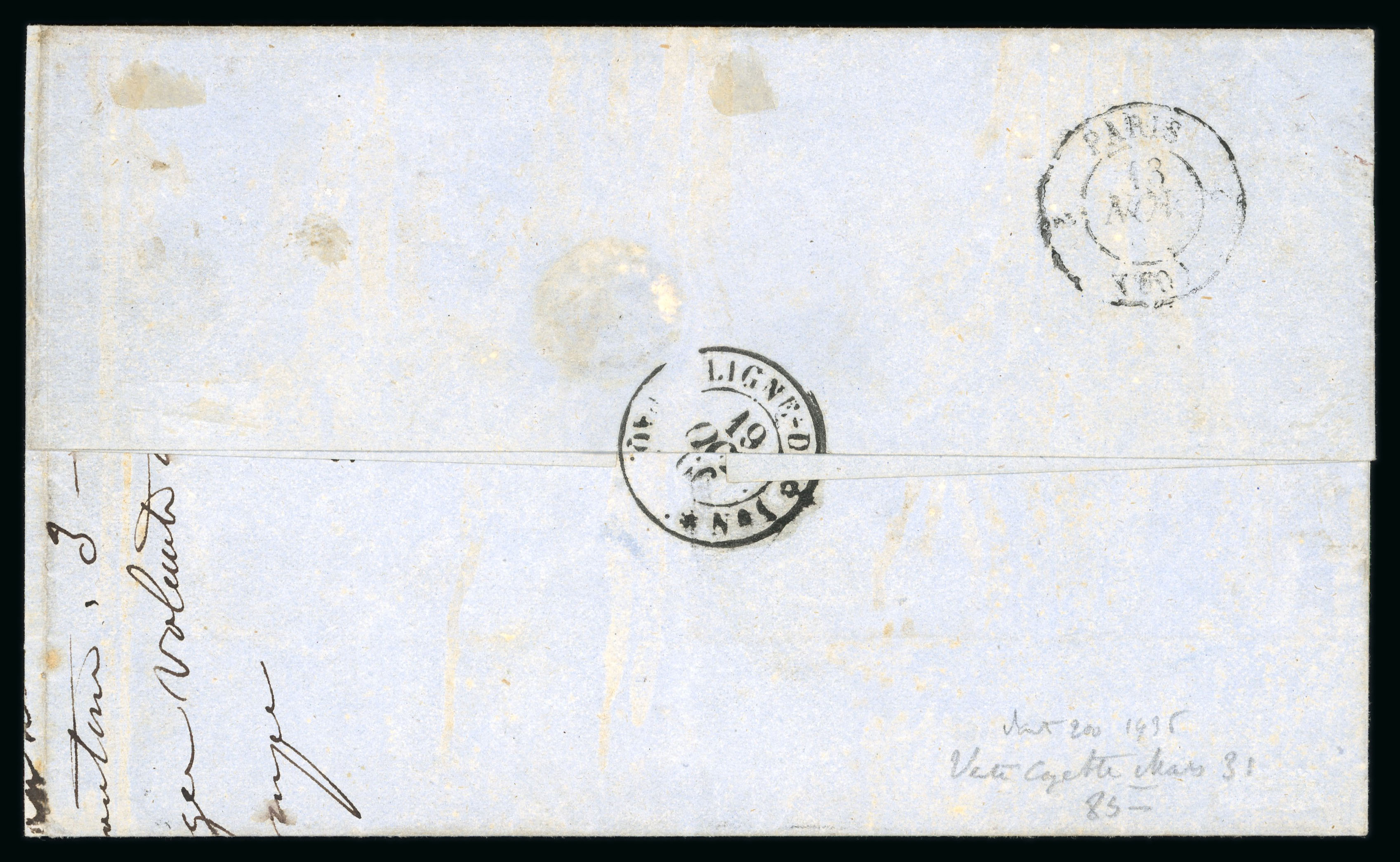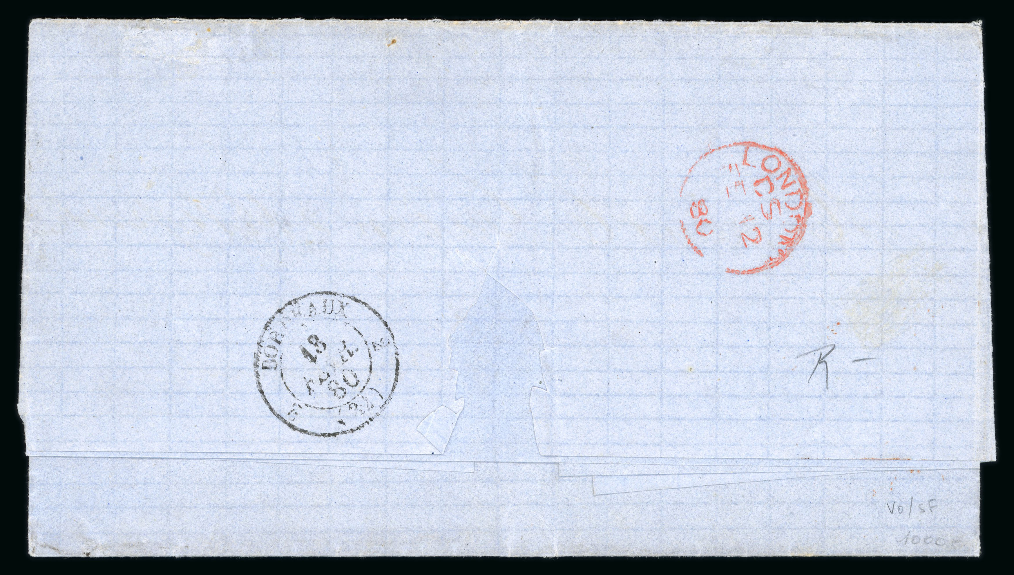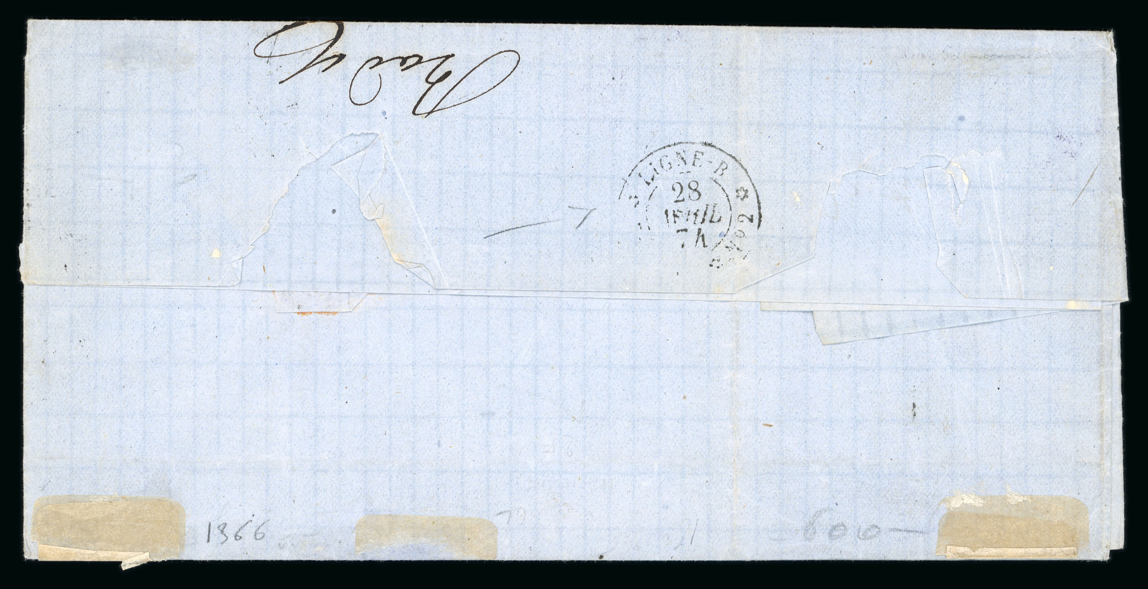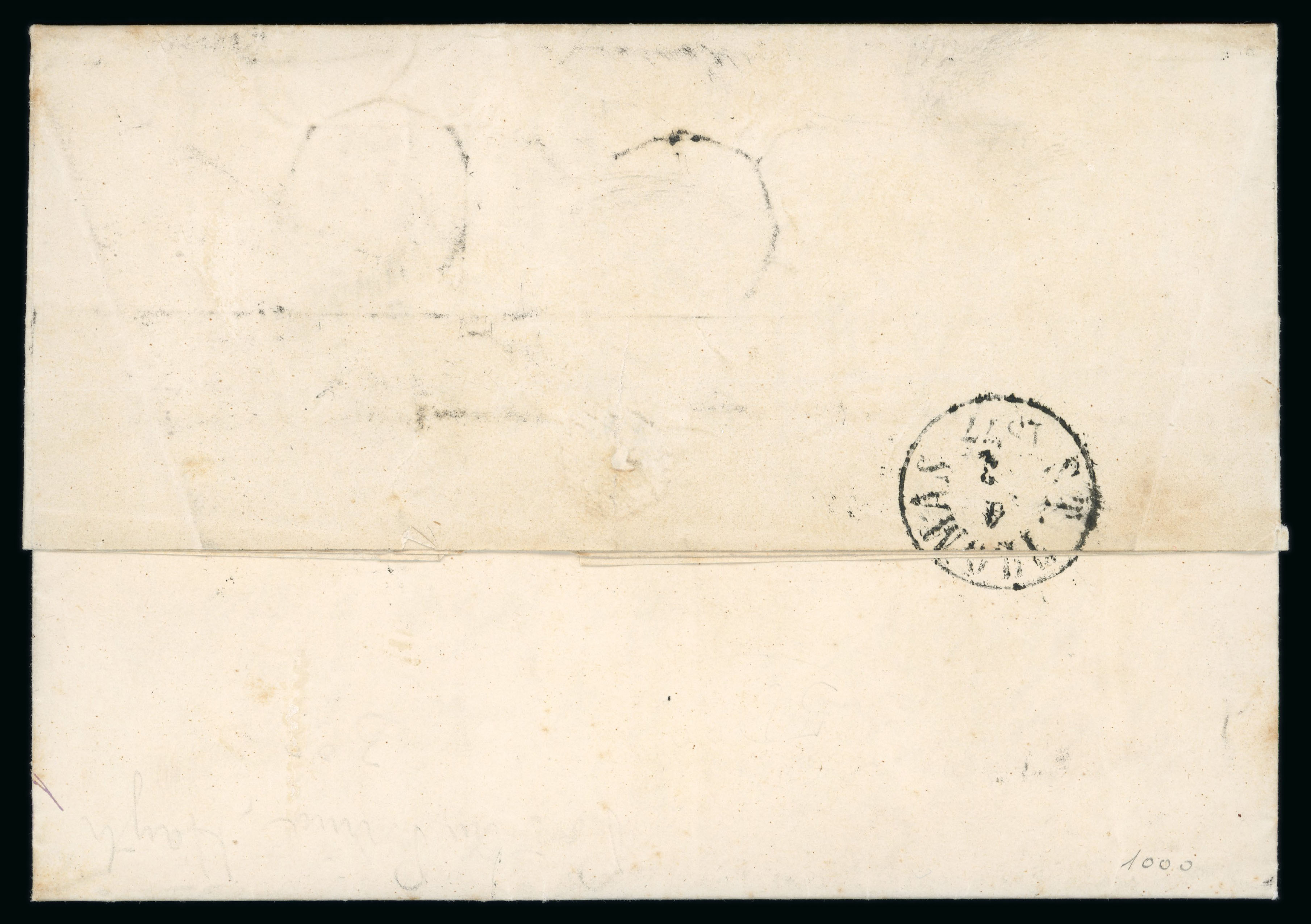 missing along top, a very rare and attractive cover. Salle ("La poste maritime francaise", tome IV, p.185) defines this datestamp as RR, "pièce d’amateur à partir de 2000", the maximum rarity, and the handstamp illustrated is from this cover, which