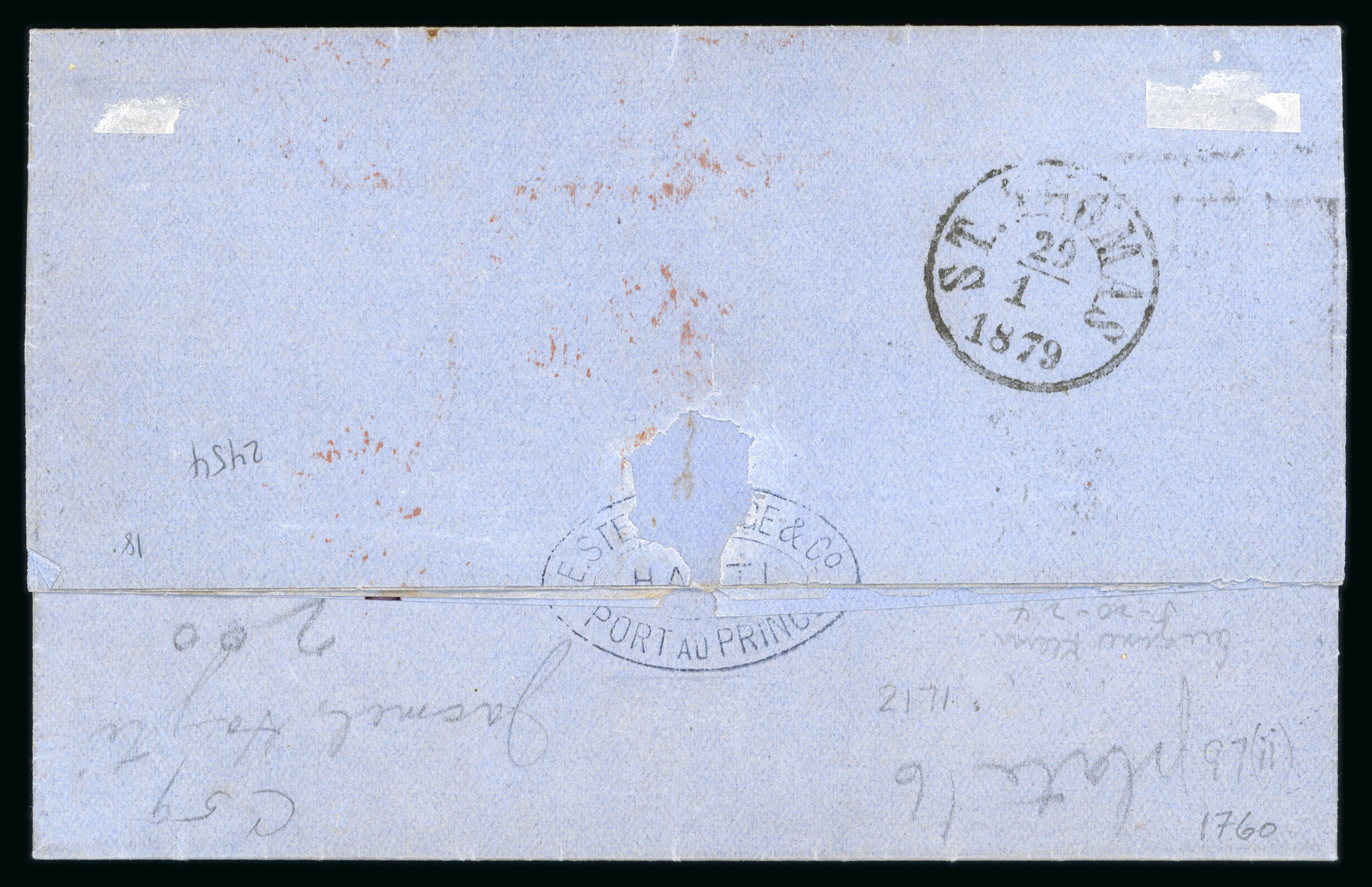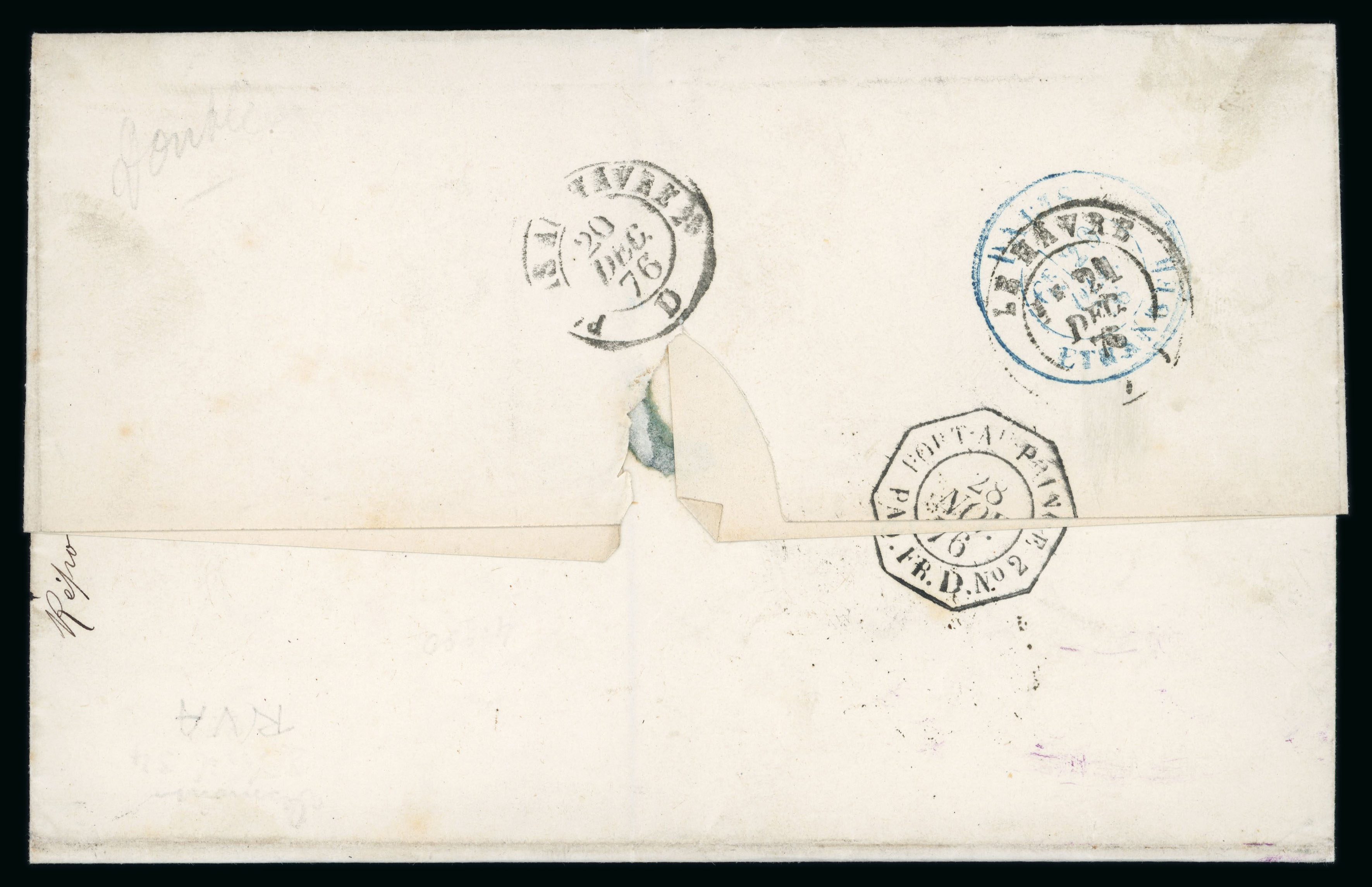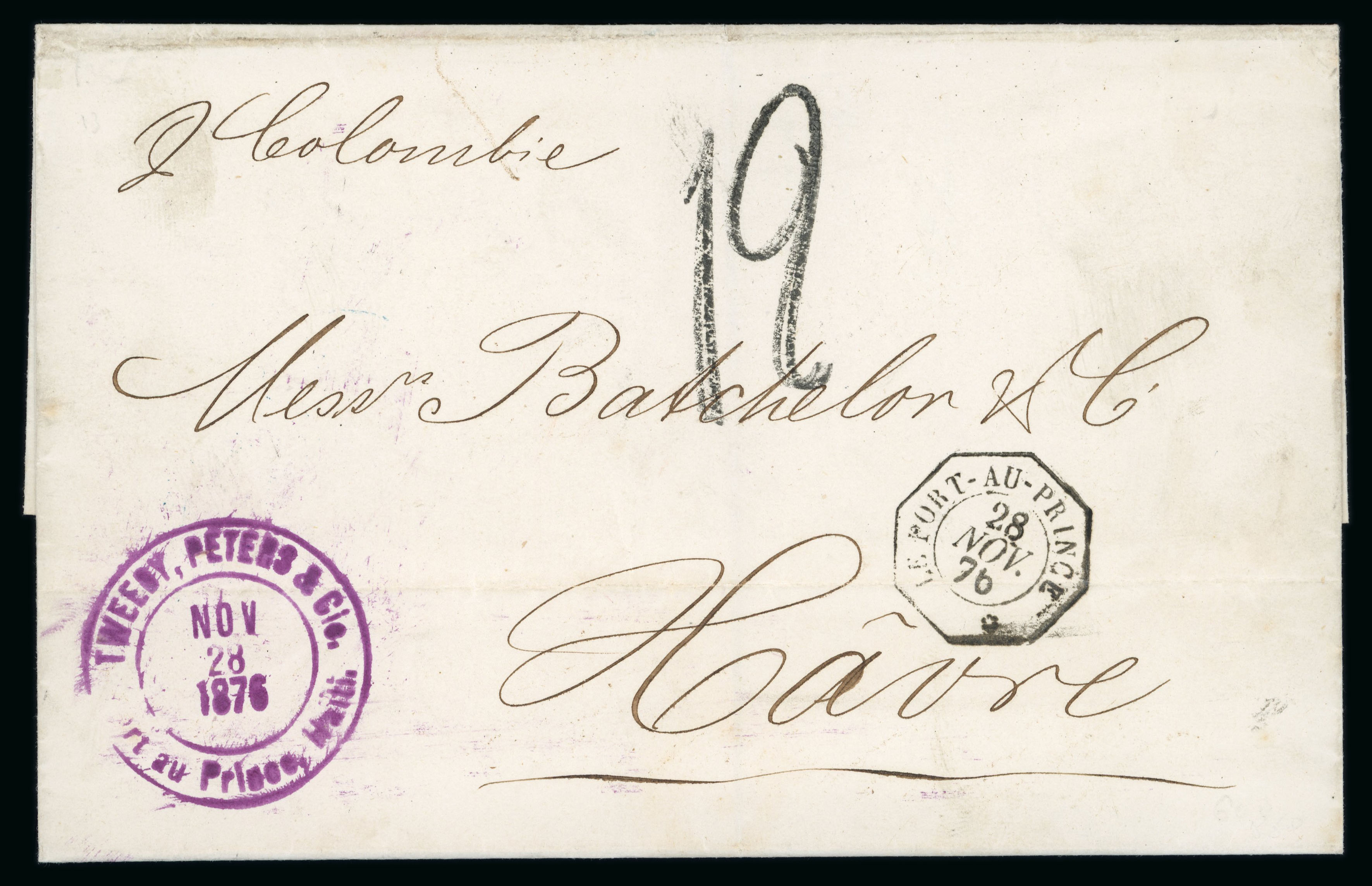 1876 (28 Nov) unpaid outer letter sheet to Havre with octagonal Port Au Prince datestamp, endorsed "pr Colombie", charged '12' decimes on arrival, reverse with D No.2 maritime date stamp and arrival cancels. An unusual unpaid item that