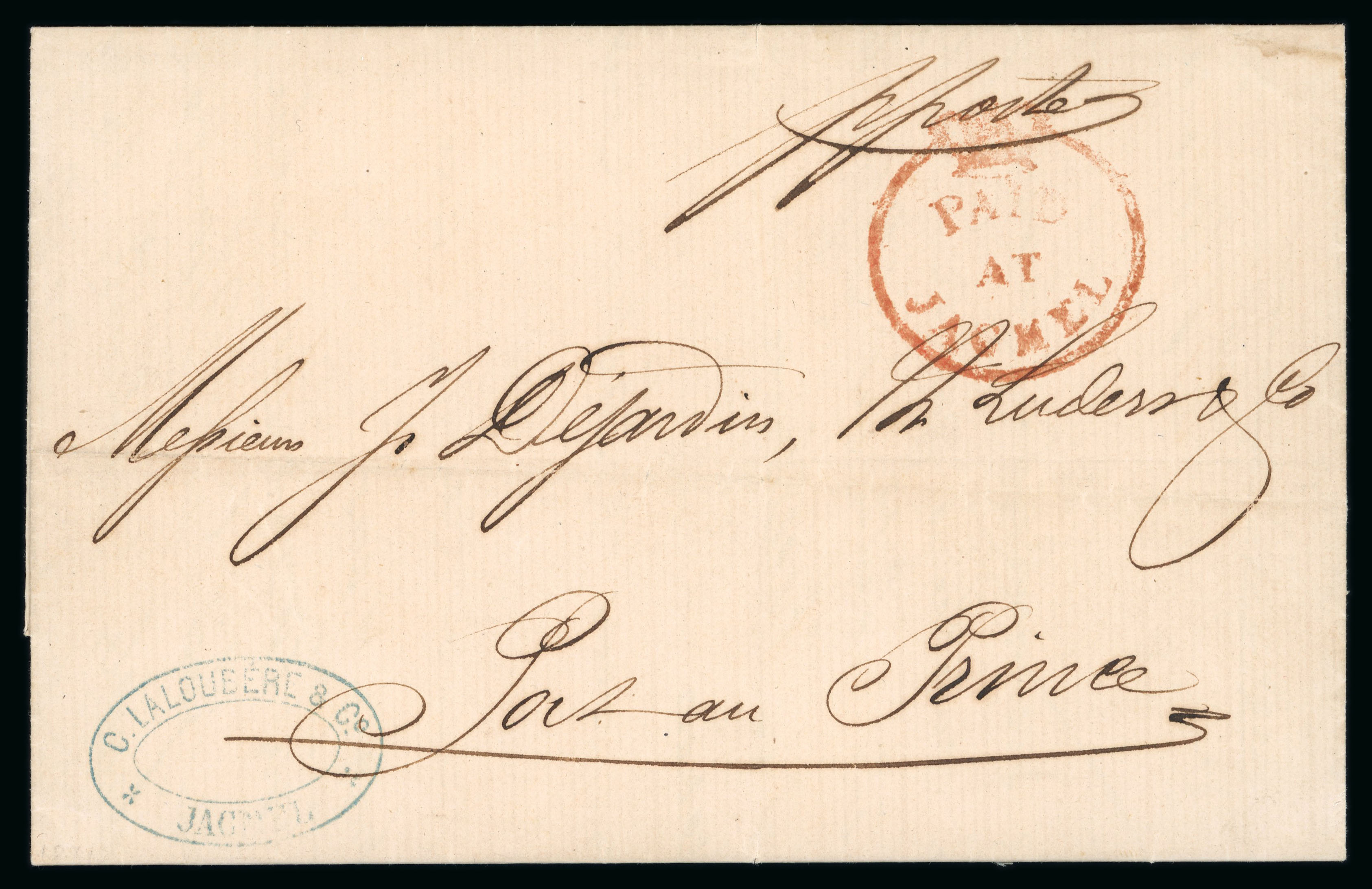 1871 (14 March) internal entire, Jacmel to Port au Prince showing good strike in red of "PAID/ AT/ JACMEL" crown circle in red, endorsed "p poste", light filing creases, a rare example of this handstamp used on internal mail. (Image 1)