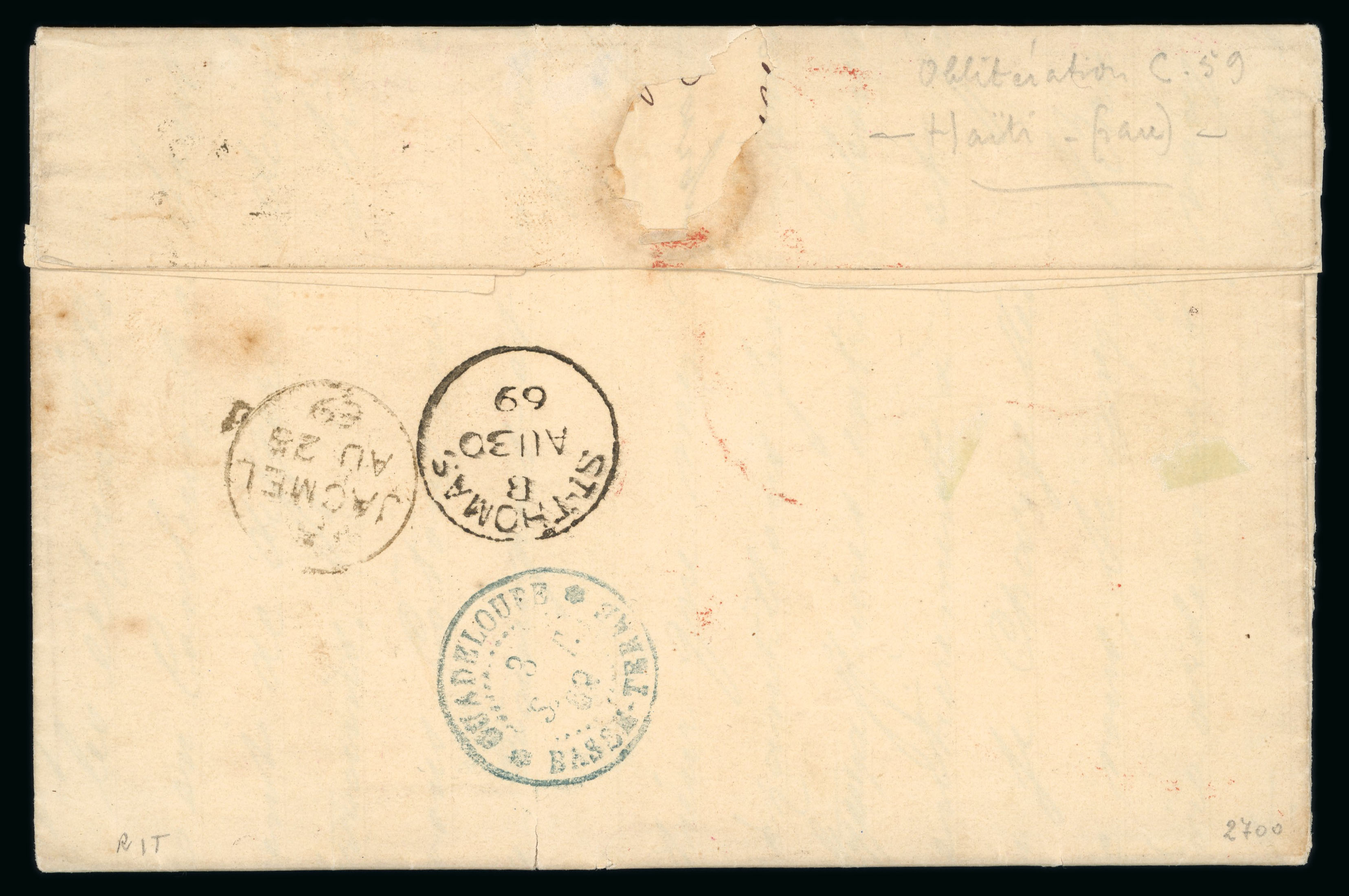 1869 (23 August) entire to Basse Terre, Guadeloupe via St Thomas, franked at 4d. for inter island tariff tied by C59 obliterator of Jacmel, unusually also showing a good strike or red Crown Circle, this handstamp and an adhesive were