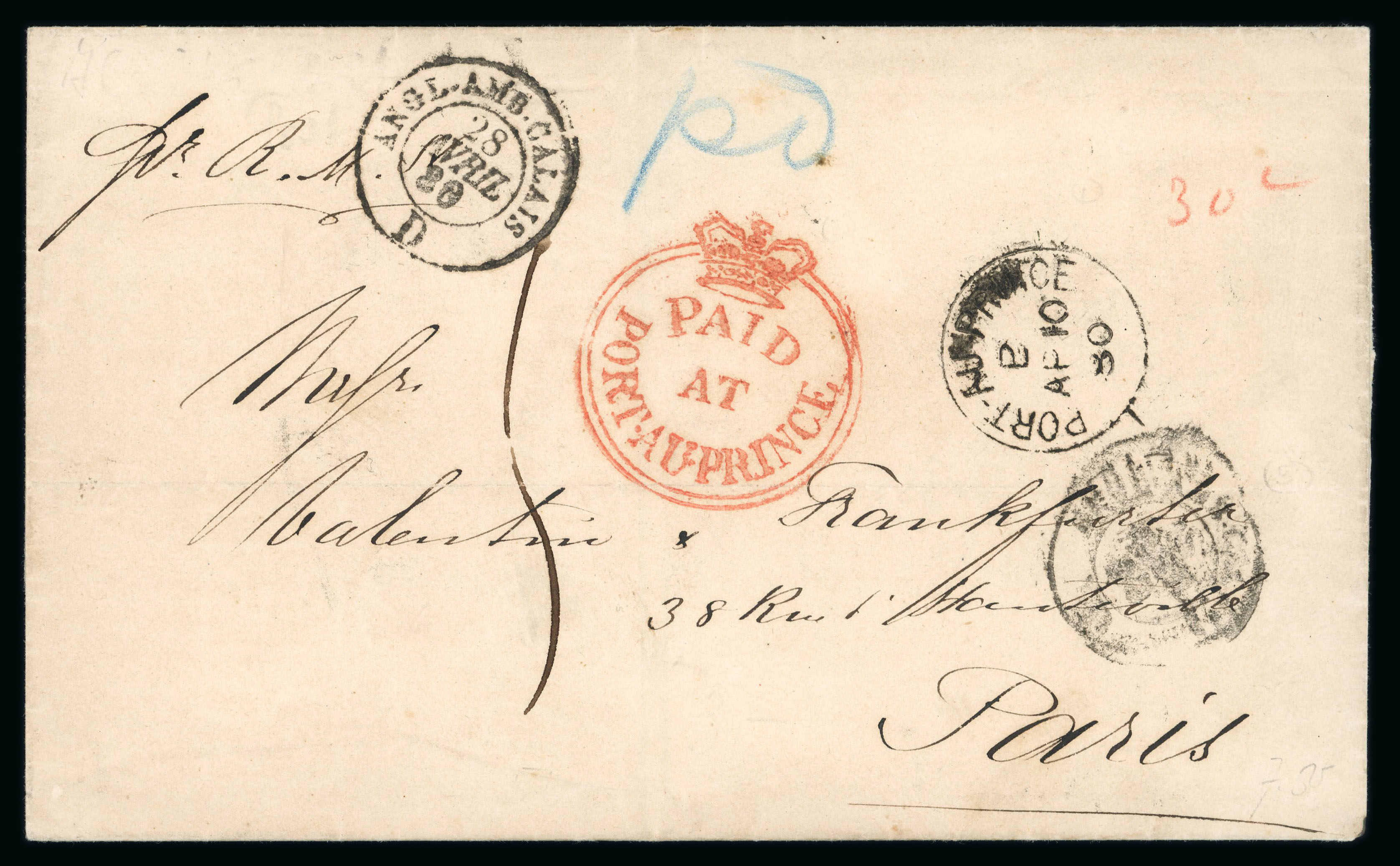 1880 outer letter sheet endorsed "pr R.M." to Paris showing an extremely fine example of large red crown circle PAID/ AT/ PORT AU PRINCE, black index 'B' cds alongside of AP 10, red London transit backstamp (AP 28), obverse with Calais