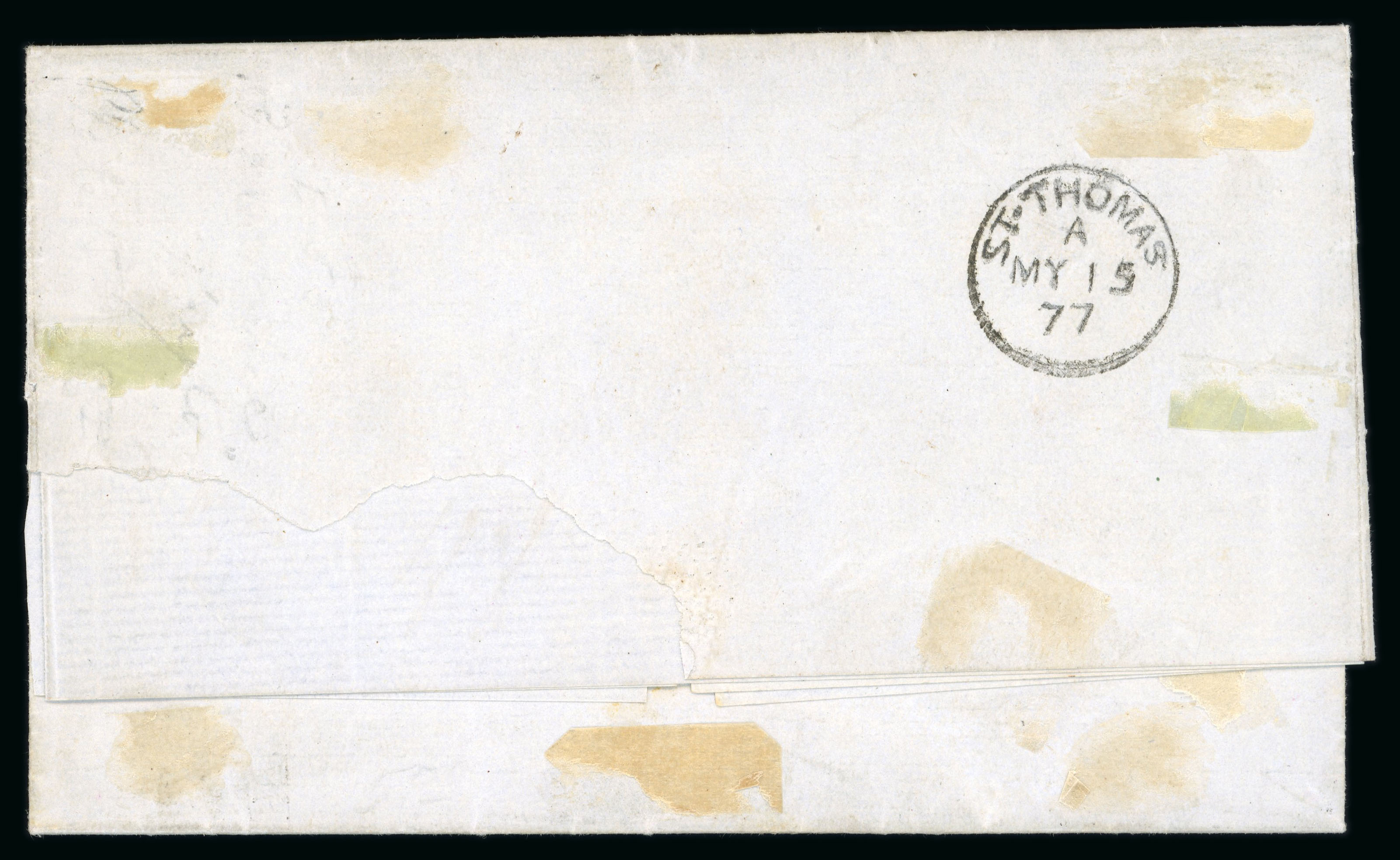1877 (11 May) entire to St Thomas paying inter Island rate with 4d. sage-green, plate 15 tied by clear horizontal E53 obliterator, Port Au Prince cds adjacent in black and British P.O. St Thomas on reverse (MY 15), small piece of reverse