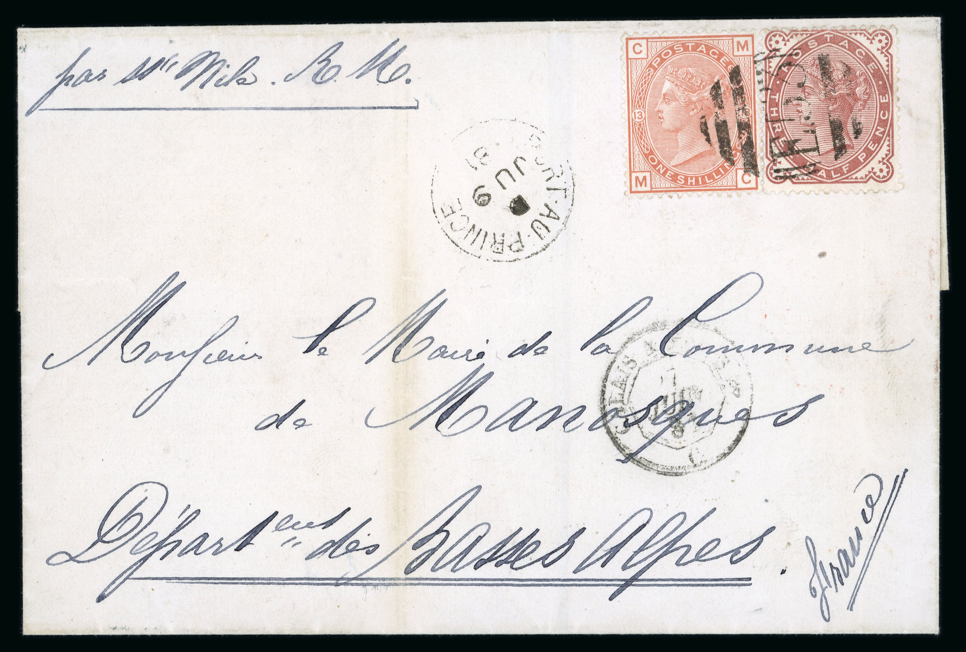 1881 (JU 9) outer letter sheet to Manosque, France franked 1880 1/- orange-brown and 1 1/2d Venetian-red cancelled by single E53 obliterator, Port Au Prince cds alongside, reverse with London transit (JU 27), Calais entry cancel of same