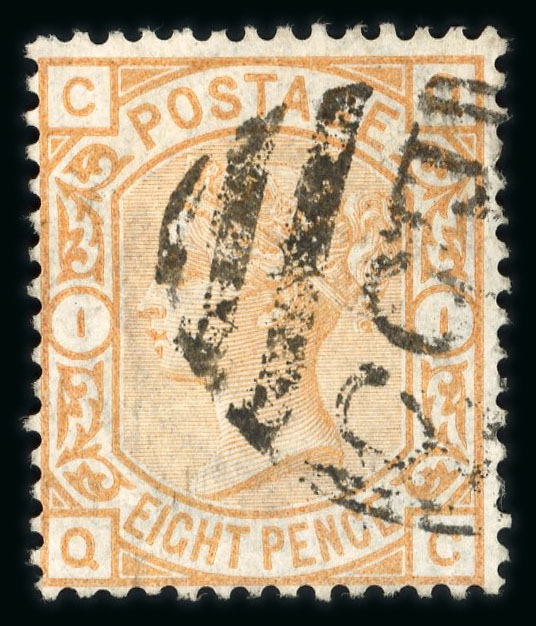 Accumulation of E53 obliterations including 1870s 1 1/2d vertical pair, 4d sage-green showing four bars (2), 8d orange, 1/- orange-brown single and re-joined pair, 2/- blue (2), 5/- with small closed tear at top, fair to fine (24 stamps